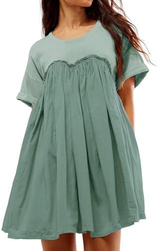 This delightful mini dress combines a casual yet chic style with practical features, making it an ideal addition to any summer wardrobe. Crafted with a flowing pleated design and a crew neck, this piece offers both comfort and style. The short sleeves and defined seaming add a trendy touch, while the wide hem design cleverly conceals the tummy, ensuring you feel confident no matter the occasion. Available in multiple colors, it can easily be paired with accessories like golden jewelry and boots, providing versatility for any outing.