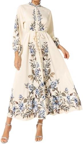 Stand Collar Long Sleeve Midi Dress Lantern Sleeves Floral Dress for Women Flower Printed Womens