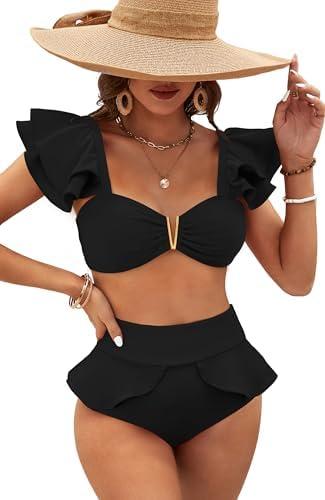 SPORLIKE Women High Waisted Swimsuit Ruffle V Neck Two Pieces Bikini Padded Bathing Suit