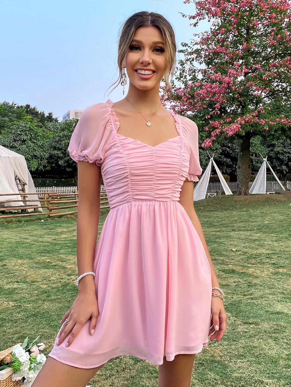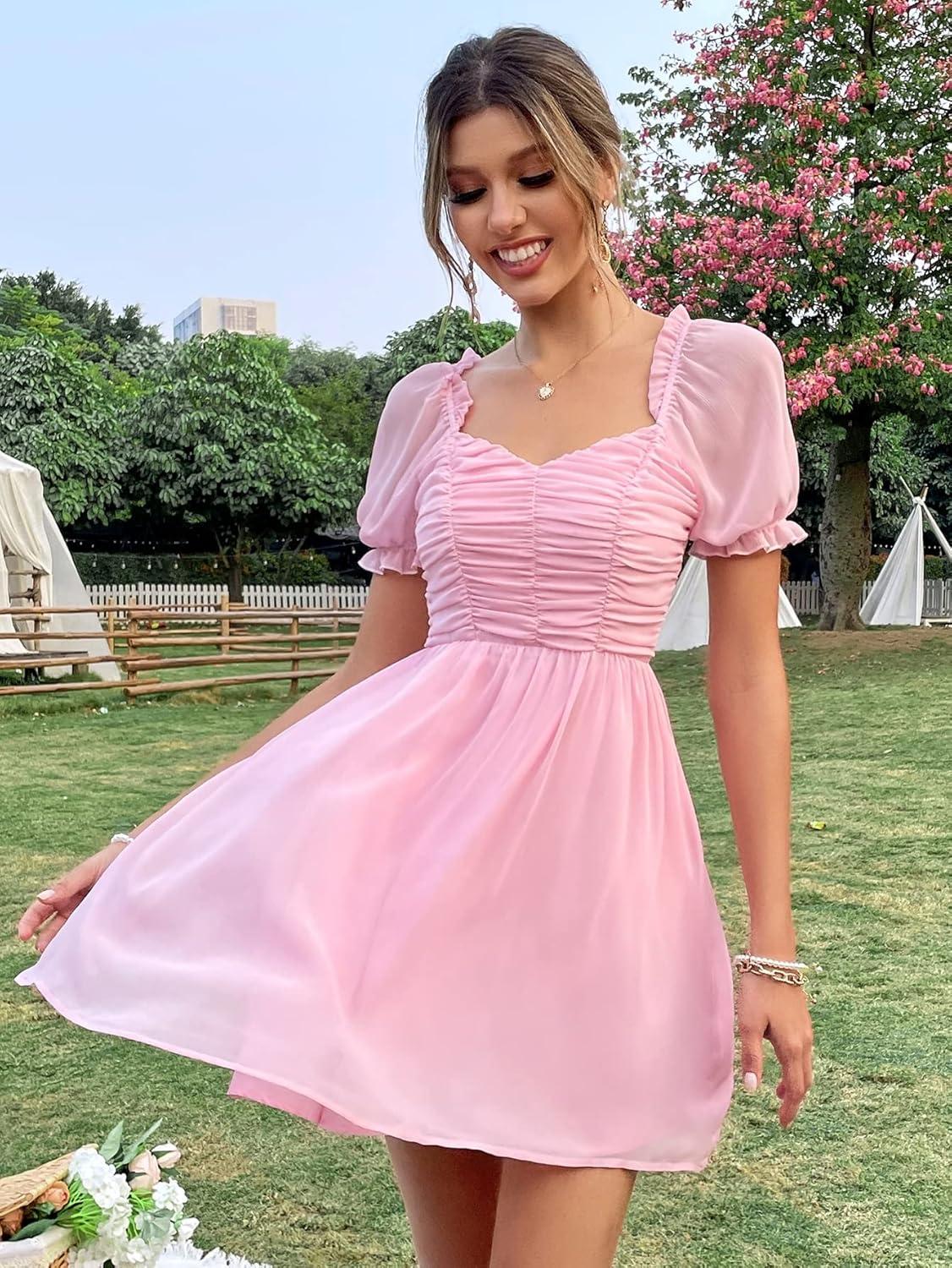 This light pink dress features a charming puff sleeve design combined with a sweetheart ruched bodice that beautifully accentuates the silhouette. The A-line swing cut provides a flattering fit that flows gracefully, making it ideal for casual outings, summer gatherings, or even as a subtle yet elegant pick for wedding guests. Its lightweight fabric and short length ensure comfort and breathability during warmer days, while the soft pastel hue brings a fresh, feminine touch to any wardrobe.