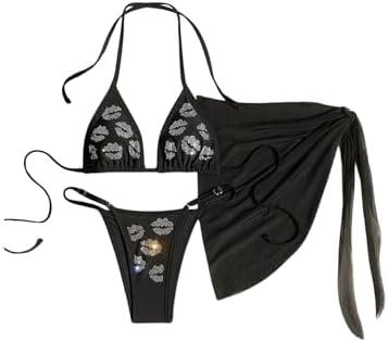 WDIRARA Women’s Skull Rhinestone Triangle Halter Tie 3 Piece Metallic Swimsuit and Wrap Skirt