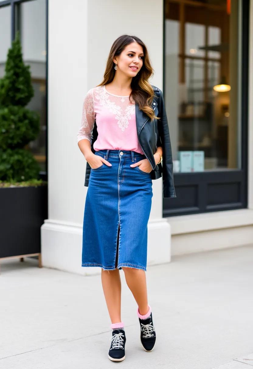 For those cozy nights in, try layering a denim mini skirt with some cozy tights, an oversized sweater, and cute fuzzy socks—the ultimate comfort outfit for a movie marathon. If your plans lean towards a more adventurous spirit, consider a long denim skirt teamed with a leather jacket and chunky sneakers. This look combines comfort and style, making it perfect for an evening stroll under the stars. Regardless of your plans, the versatility of a jean skirt allows you to express your unique style and mood. Explore more stylish outfit ideas at Pinterest.