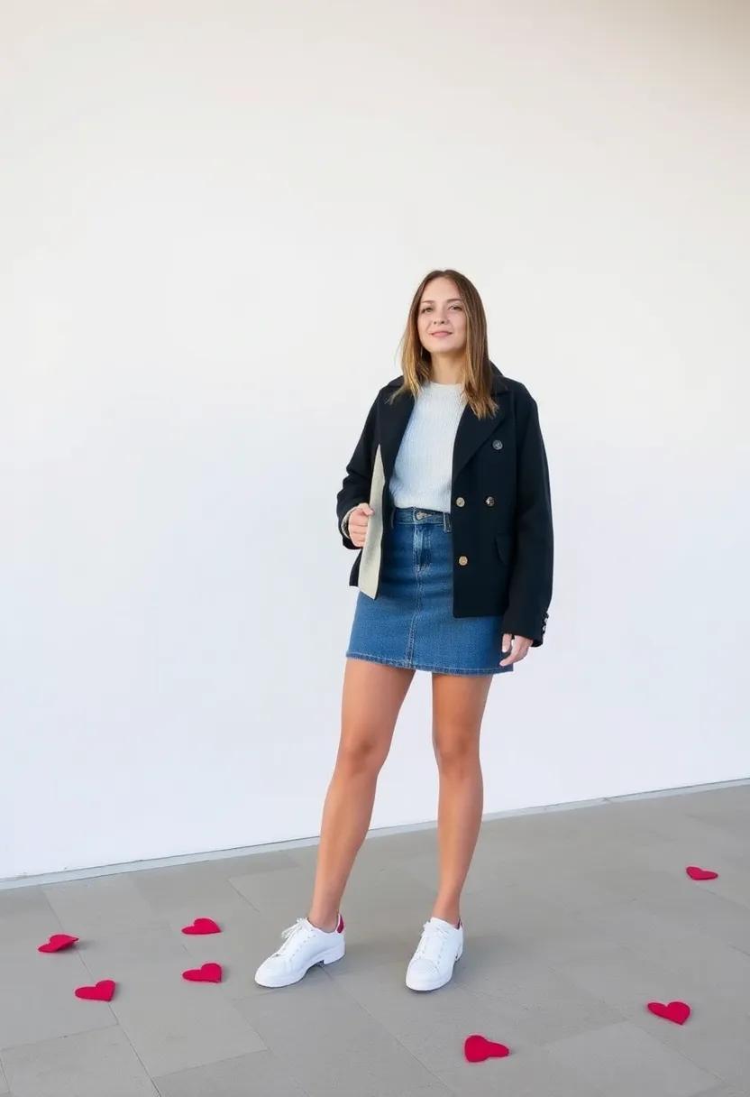 Elevate your Valentine’s Day look with a jean skirt that effortlessly blends style and comfort. For a relaxed yet chic vibe, pair your skirt with a soft, oversized sweater in a pastel hue or classic cream. This creates a romantic contrast against the denim and is perfect for a cozy dinner date or a casual outing. To enhance your ensemble, consider accessorizing with delicate gold jewelry and a crossbody bag, keeping your outfit functional yet fashionable. Footwear options like ankle boots or trendy sneakers can add a modern twist while ensuring maximum comfort.