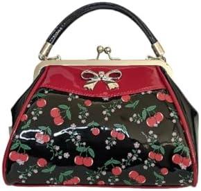 This delightful handbag showcases a charming cherry and flower blossom print, perfectly blending flirty aesthetics with vintage charm. It features a classic kiss lock top that not only enhances its retro appeal but also provides easy access to your essentials. With a spacious interior that includes a zippered internal pocket and two additional pouches, organization becomes a breeze. The added convenience of a zippered external pocket allows for quick storage of smaller items, making it an ideal companion for every occasion. The handbag’s dimensions of 9″ x 3″ x 7″ with a 5″ handle drop make it both compact and practical, striking a balance between style and functionality.