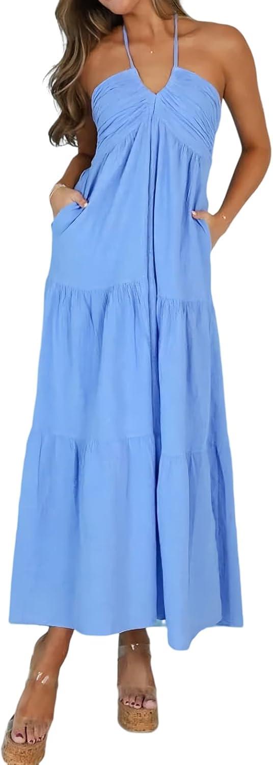 Women’s Casual Halter Tiered Vacation Maxi Dress with Pockets