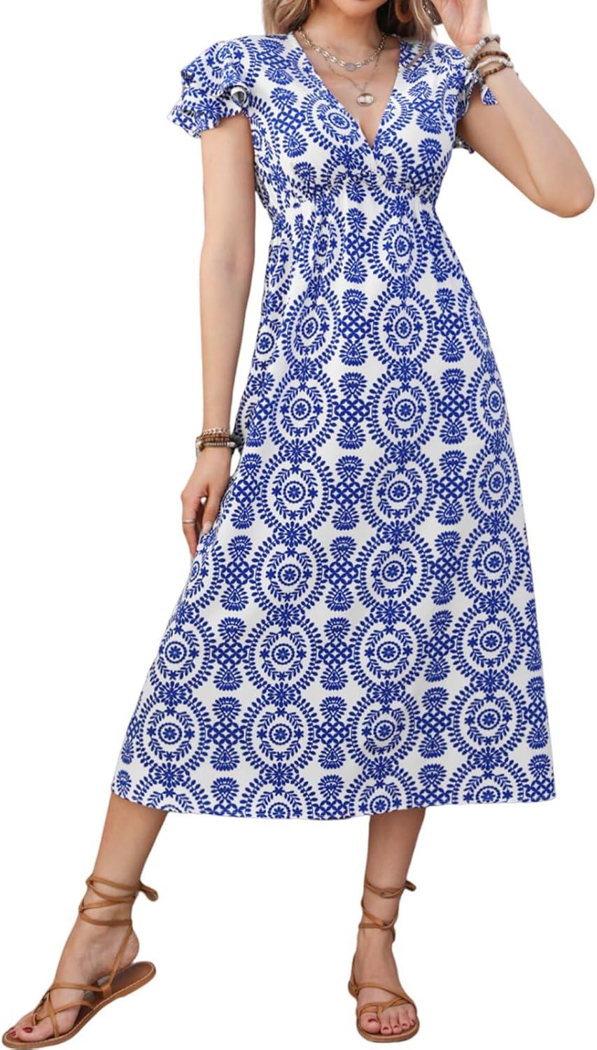 miduo Womens Deep V Neck Flutter Short Sleeve Open Back Flowy Maxi Long Dresses