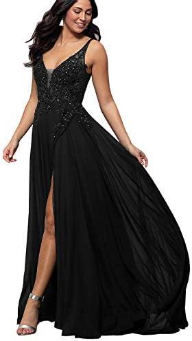Sukleet Women’s V Neck Lace Appliqued Prom Dresses A-line High Slit Formal Evening Party Gowns