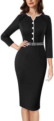 This chic dress is designed with a stylish pleated notch V neckline, complemented by 3/4 sleeves and an adjustable belt to provide a flattering silhouette. The decorative buttons and piping add a touch of elegance, while the concealed back zipper maintains a seamless look. With its knee-length bodycon style and a subtle back slit, the design allows for easy movement, making it a perfect choice for the office, business meetings, or smart casual outings. Ideal for Spring, Fall, and Winter, it can easily transition from church to job interviews or dinner dates.