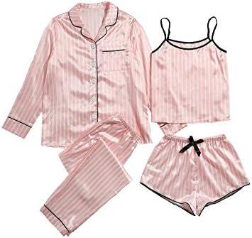Satin Pajama Set for Women 4Pcs Pjs Babydoll Lingerie Cami Nightgown‍ Shorts with Robe Set⁢ Sexy Lace Sleepwear Sets