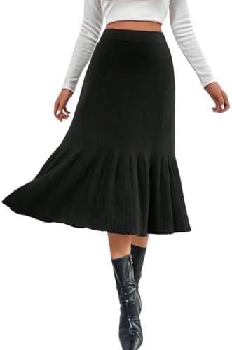 chouyatou Women’s Elegant Ruffle Hem Pleated Knit Skirt High Elastic Waist A-Line Midi Long Skirt
