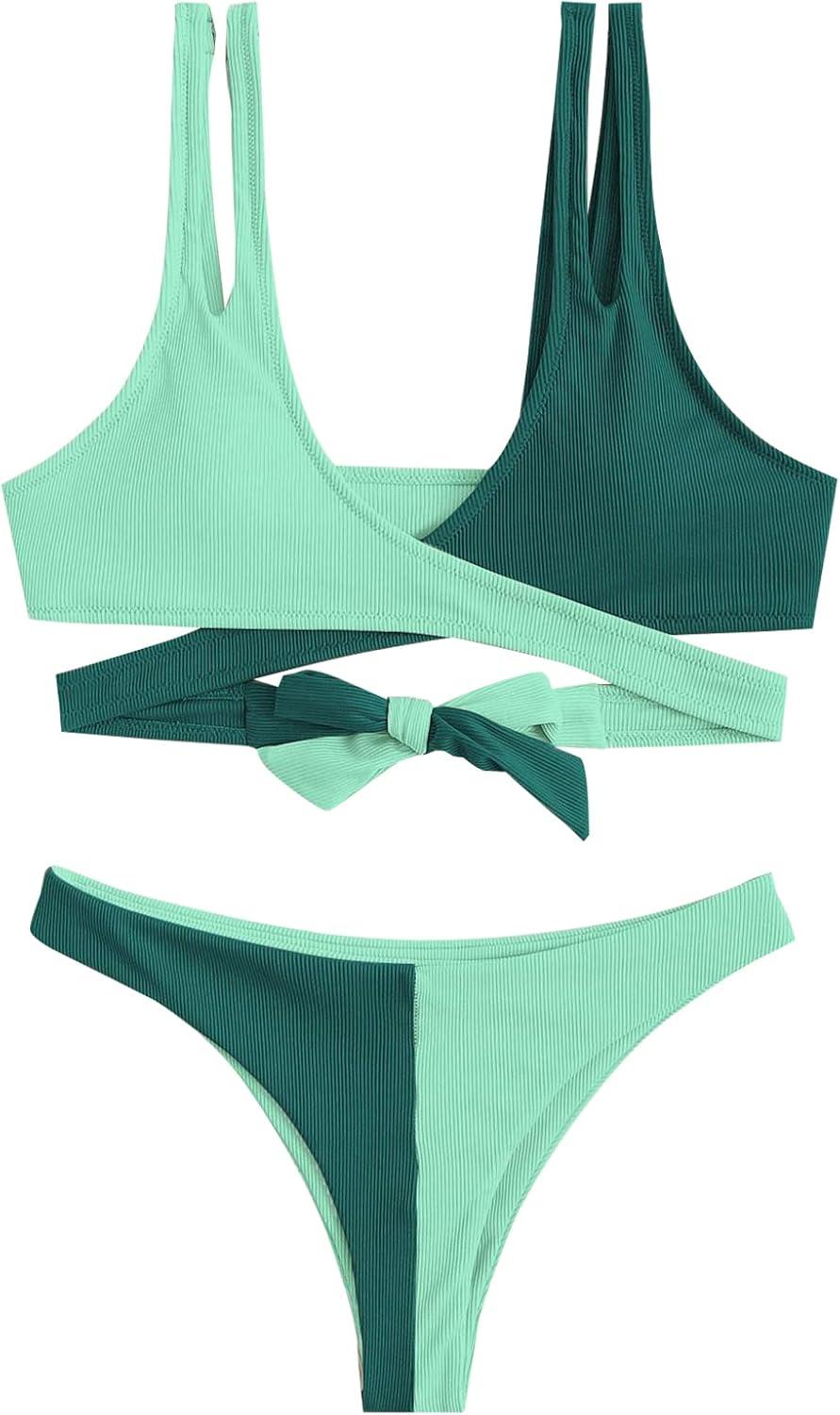 ZAFUL Two tone Colorblock Swimsuit for Women Sexy Wrap Swimwear Criss Cross Ribbed Bikini Set