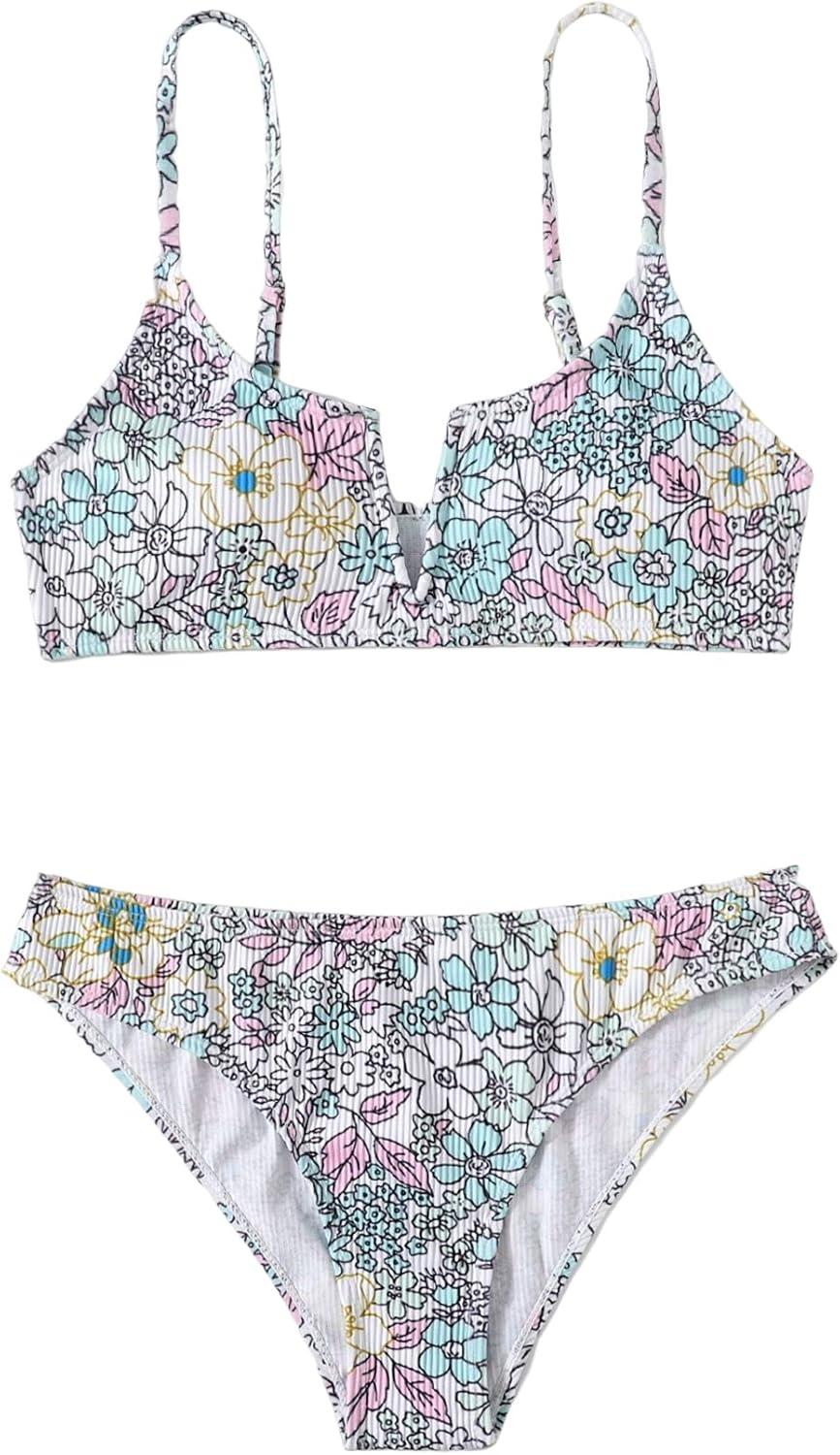 SOLY HUX Women’s Floral Print Spaghetti Strap Bikini Sets Ribbed V Bathing Suit 2 Piece Swimsuit