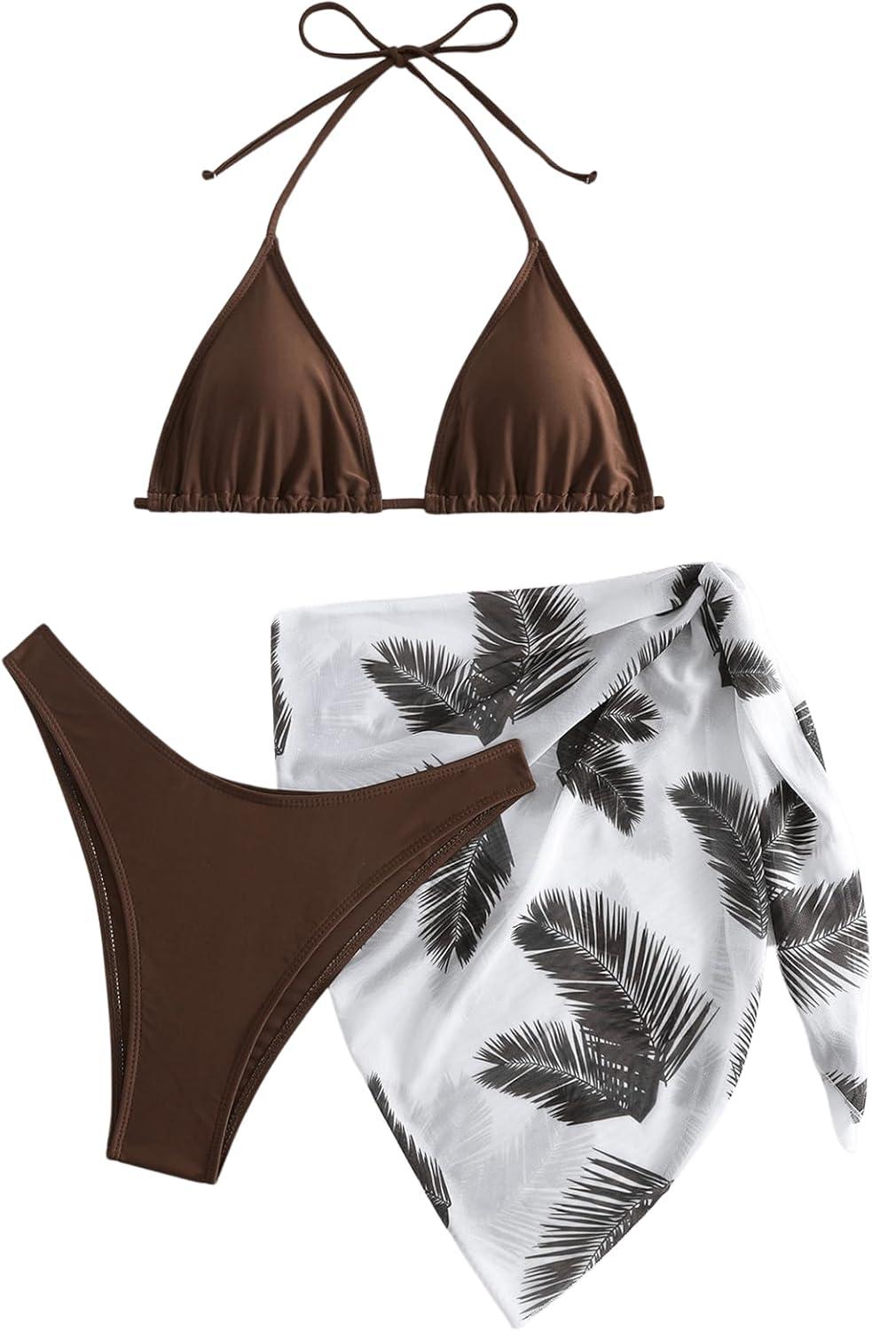 SHENHE Women’s 3 Piece Textured High Cut Halter Triangle Bikini Swimsuit with Cover Up
