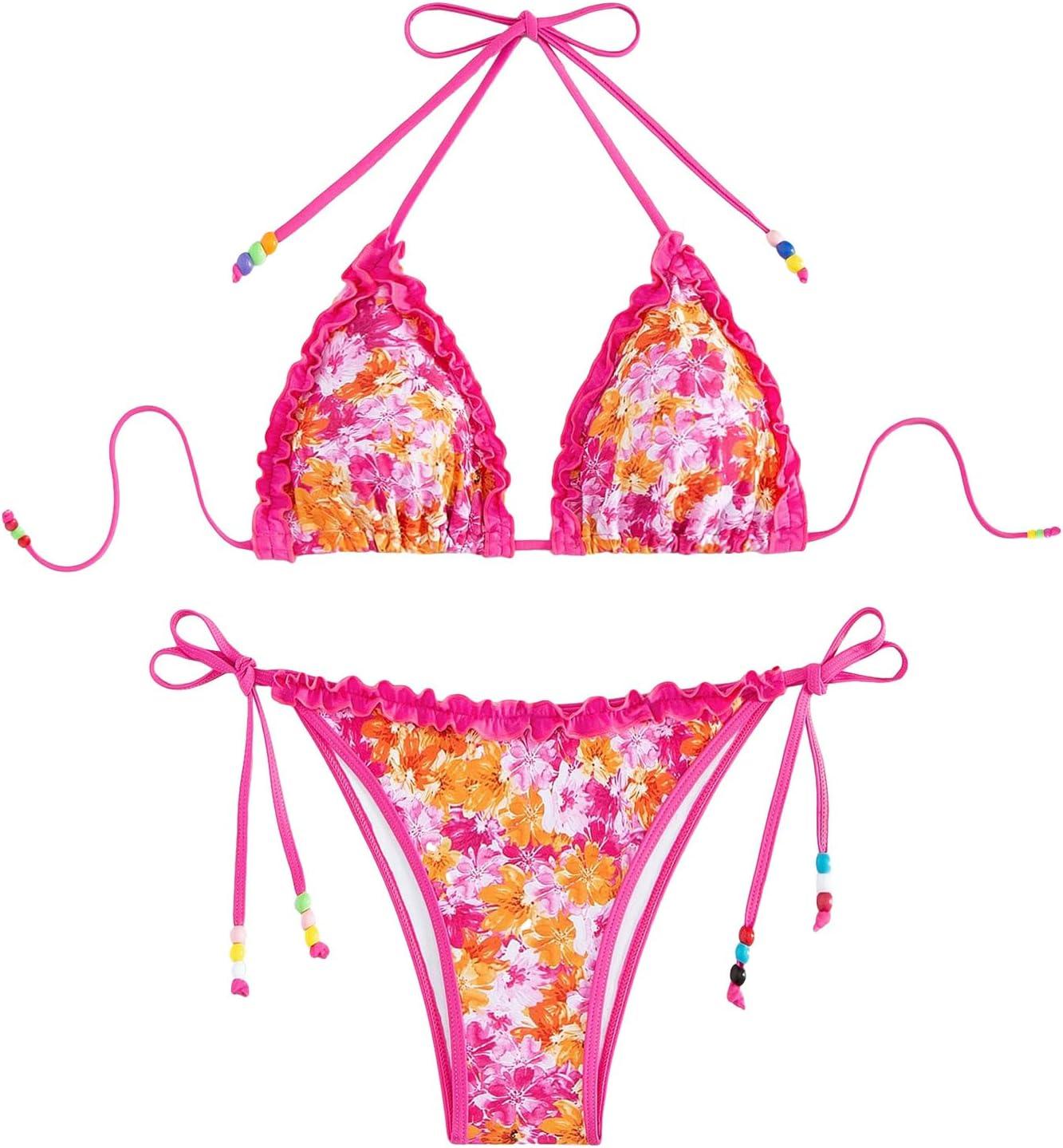 SweatyRocks Women’s 2 Piece Swimsuit Floral Print Halter Triangle Frill Trim Bikini Set