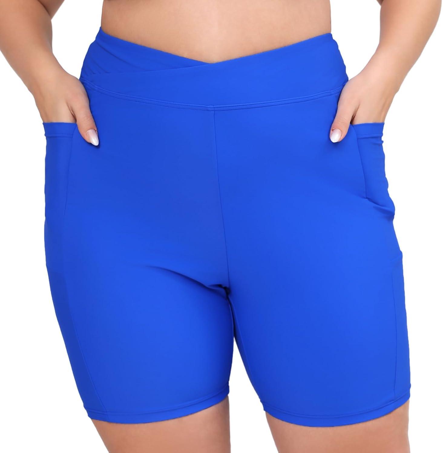 Women’s 7″ Plus Size Cross High Waisted Board Shorts with side Pockets Boyshorts Swimsuit Bottoms