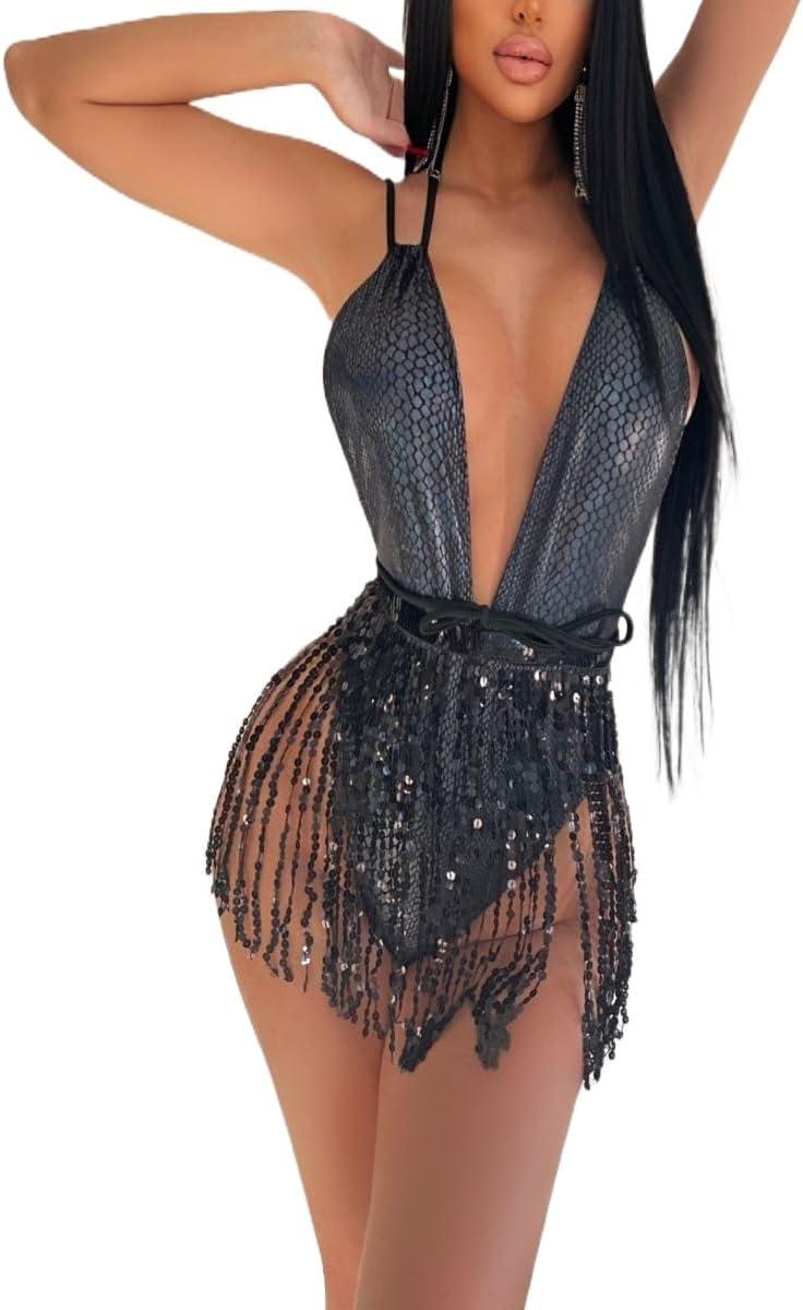 Women’s Halter Bikini ⁢Set Metallic Shiny Fringe Swimsuit Deep V Shoulder Straps1 Piece Bathing Suit