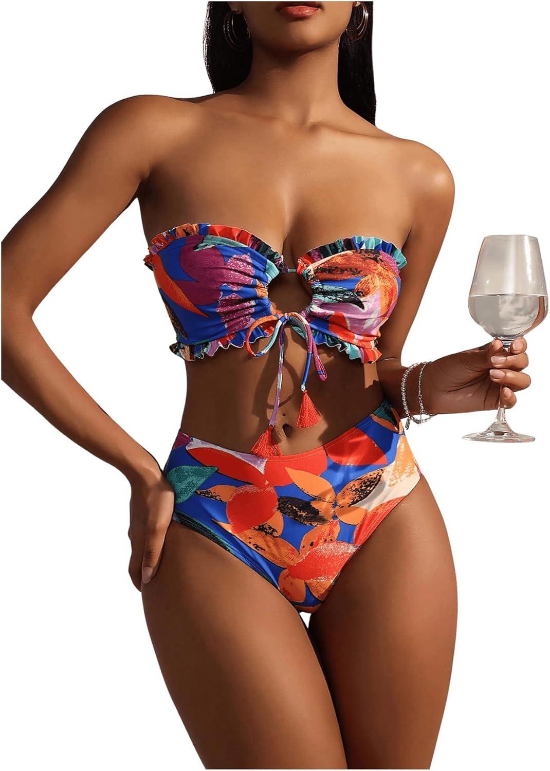 GORGLITTER Women’s Strapless swimsuits Graphic Frill Trim Tie Front‍ High Waisted⁣ Bikini Sets⁣ Multicolor Medium
