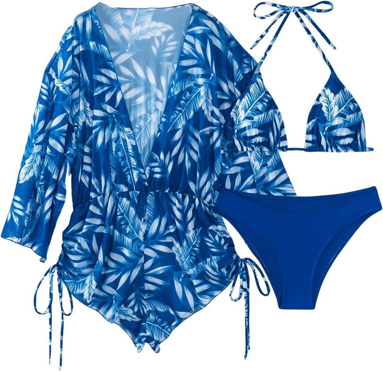 SHENHE​ Women’s 3 Piece swimsuit Bikini Set Halter Triangle Bathing Suit with Beach Cover Up Swimwear Tropical Blue Medium