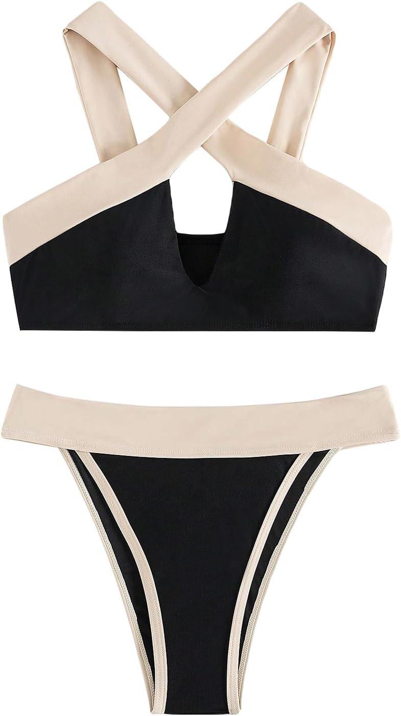 OYOANGLE Women’s 2⁣ Piece Color Block Criss Cross Bikini Swimsuit Cut Out Halter Bathing Suits Swimwear