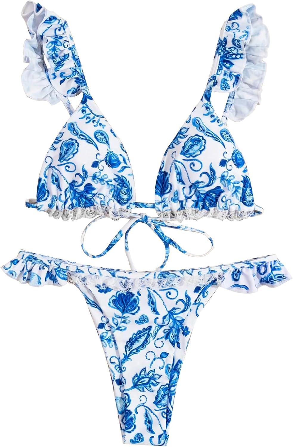 Stylish Two-Piece Floral Swimsuit with Ruffles and Lace