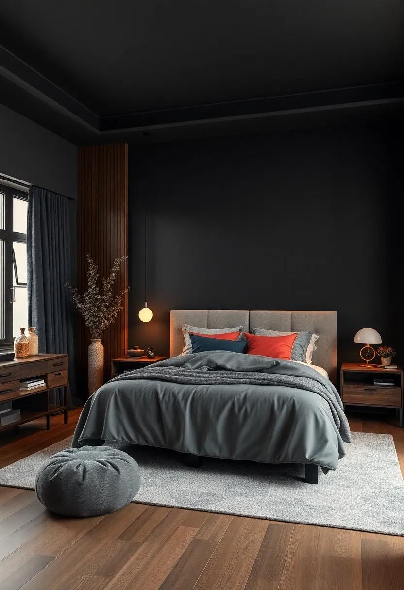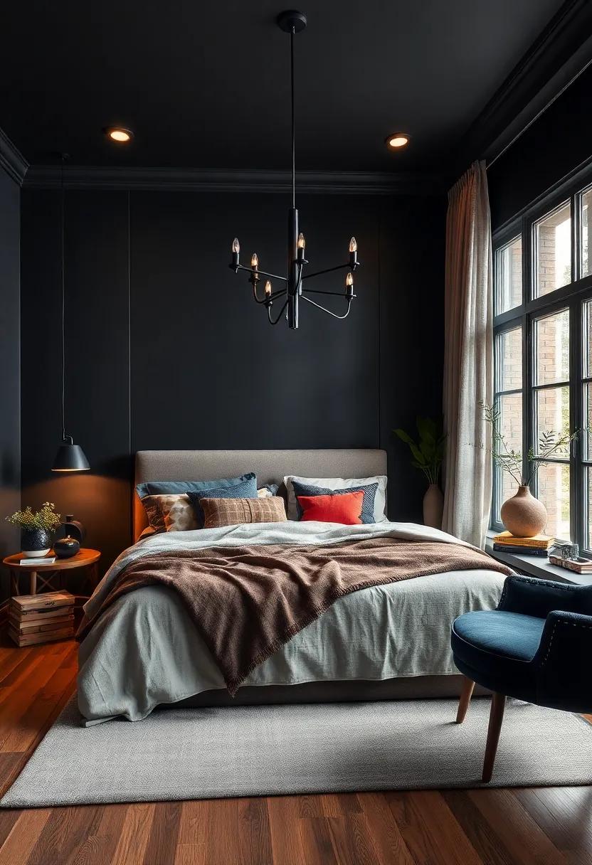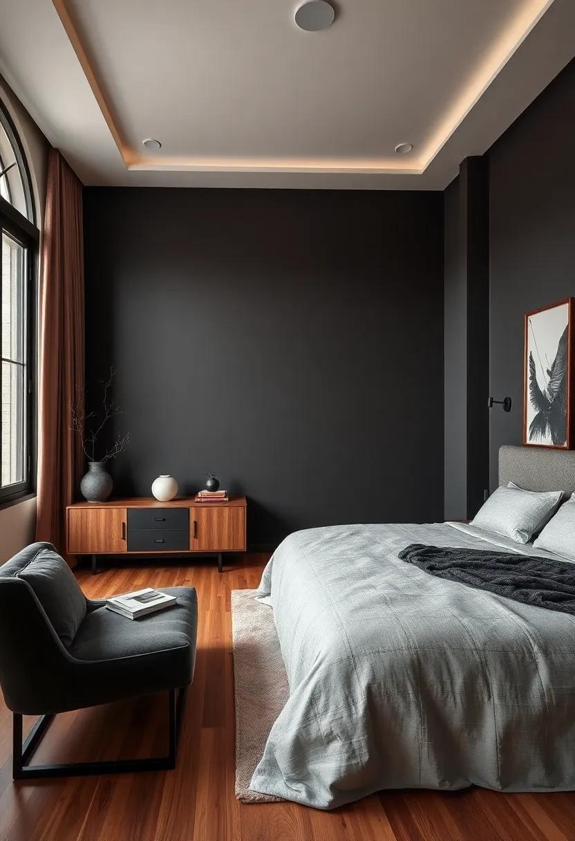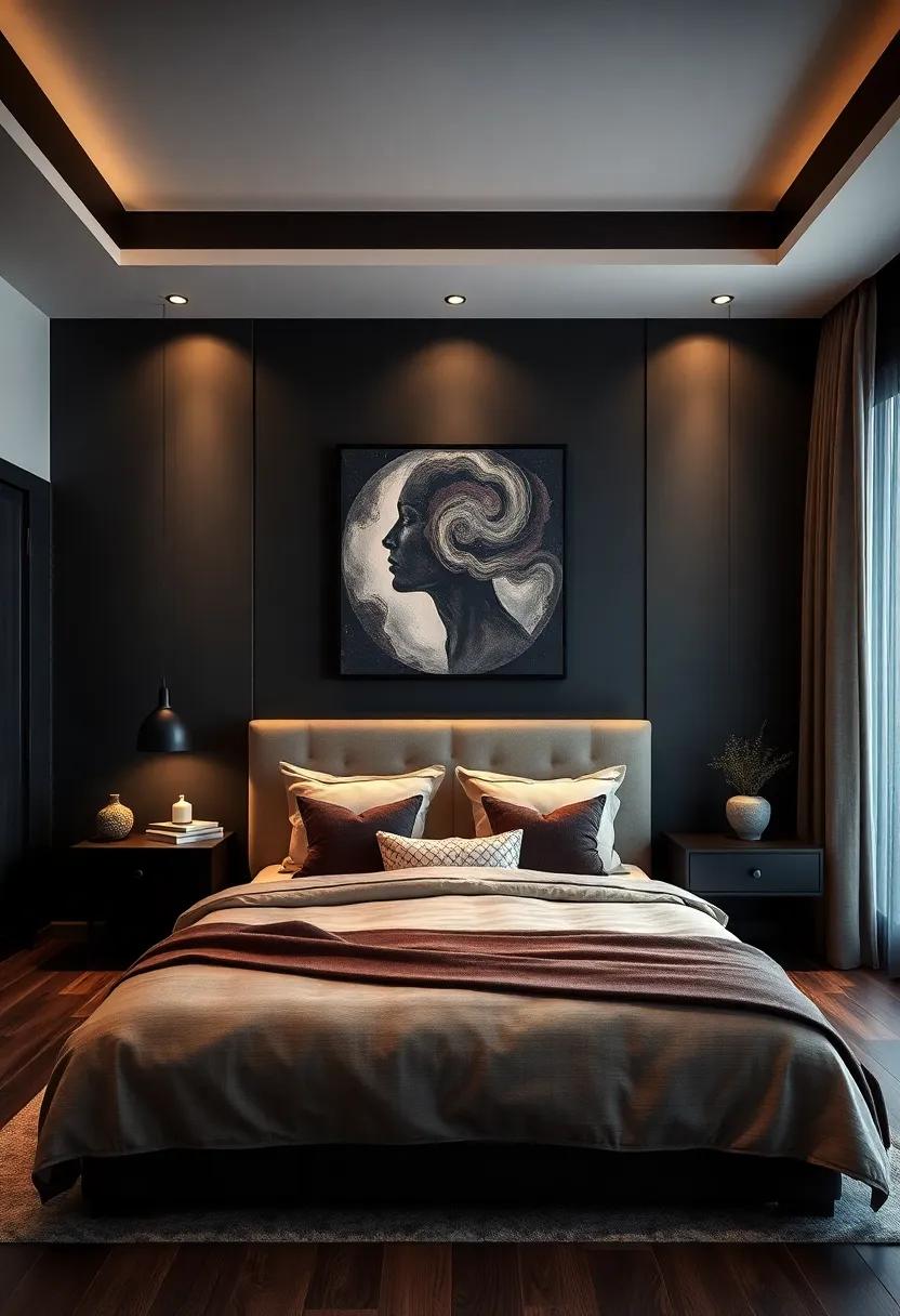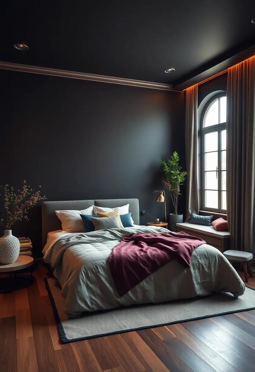 To enhance the cozy vibe, incorporate a mix of textures into your dark-toned sanctuary. Layering plush throws and velvet pillows can add warmth and invitation to your sleeping area. Consider incorporating soft lighting fixtures, such as brass or matte black lamps, to cast a comforting glow against the darker walls. You might also add personal touches through elements like a warm wood accent chair or a handwoven rug that provides a tactile contrast against the dark floor. The combination of colors, textures, and lighting will create an artistic refuge where relaxation reigns supreme.