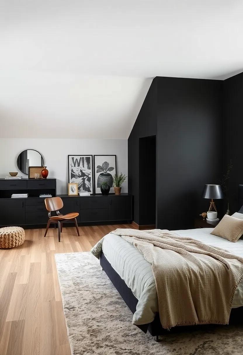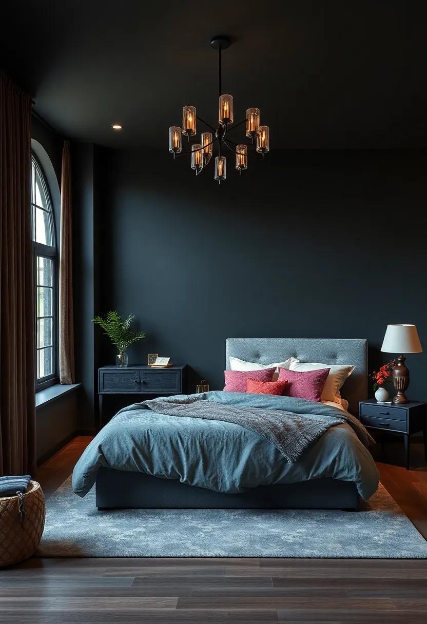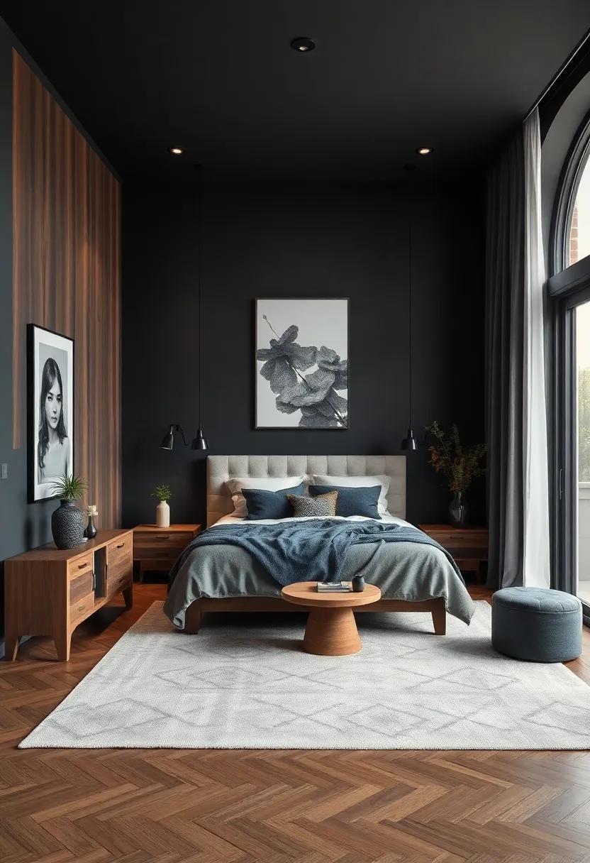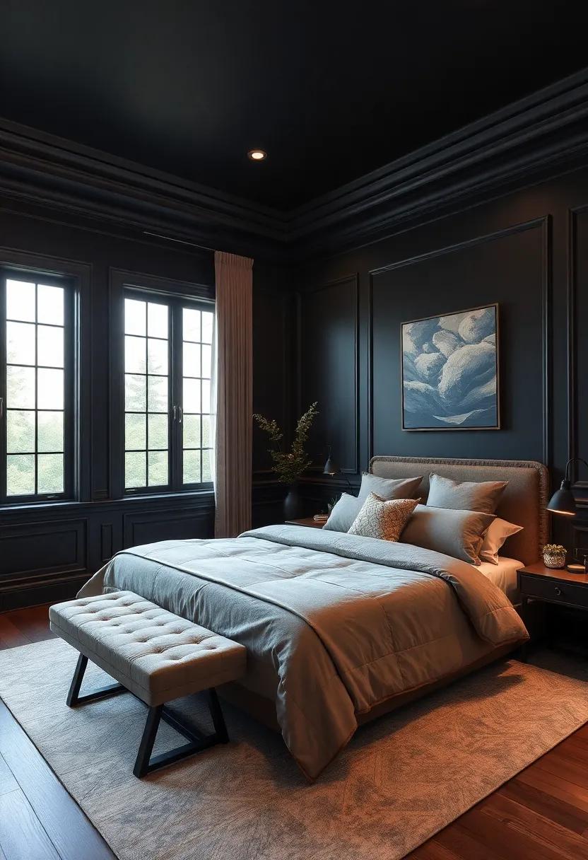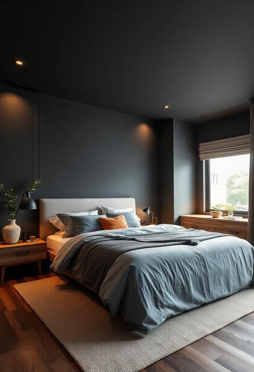 To enhance the cozy vibe, incorporate a mix of textures into your dark-toned sanctuary. Layering plush throws and velvet pillows can add warmth and invitation to your sleeping area. Consider incorporating soft lighting fixtures, such as brass or matte black lamps, to cast a comforting glow against the darker walls. You might also add personal touches through elements like a warm wood accent chair or a handwoven rug that provides a tactile contrast against the dark floor. The combination of colors, textures, and lighting will create an artistic refuge where relaxation reigns supreme.