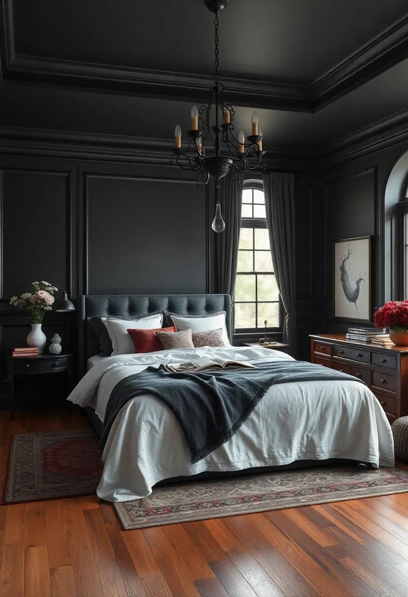 To achieve a harmonious ambiance in a bedroom adorned with dark shades, introducing light accents is crucial.Creating contrast with pieces like light-colored linens, soft throw pillows, and delicate drapery can brighten the space and soften the boldness of deeper hues. Shades of cream, pale gray, or muted pastels work effectively to lift the mood while enhancing the elegance of the darker walls. Incorporate these lighter elements through: