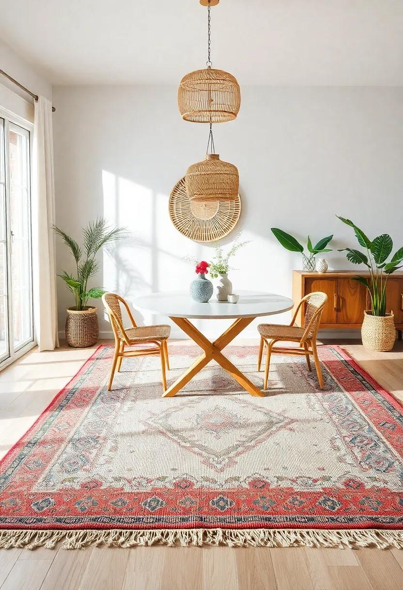 - Indoor-outdoor rugs: Durable and easy to clean, these are perfect for busy dining spaces.