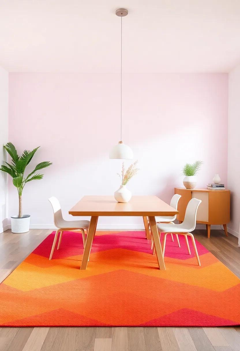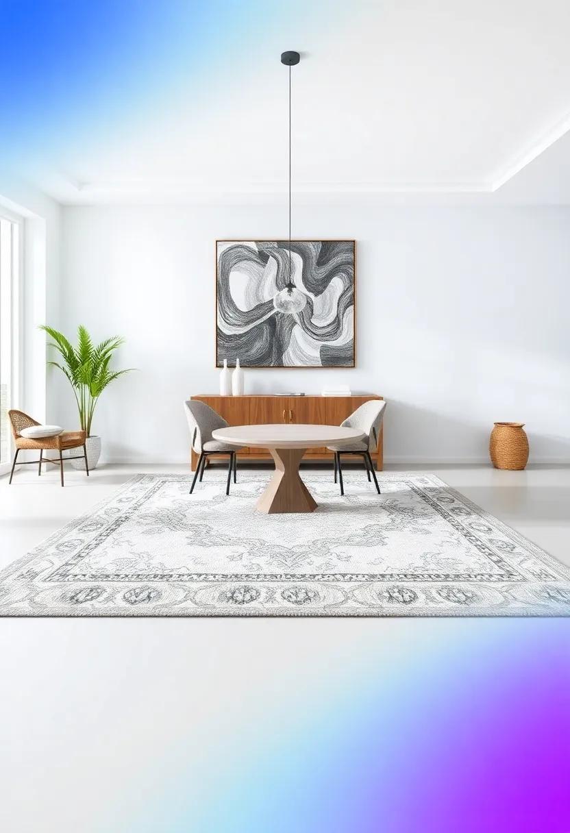 Incorporating a statement rug with an oversized pattern also involves strategic placement and color selection. Opt for designs that align with your existing decor or color palette, ensuring that they tie the room together. Here are some tips to enhance your dining room with statement rugs: