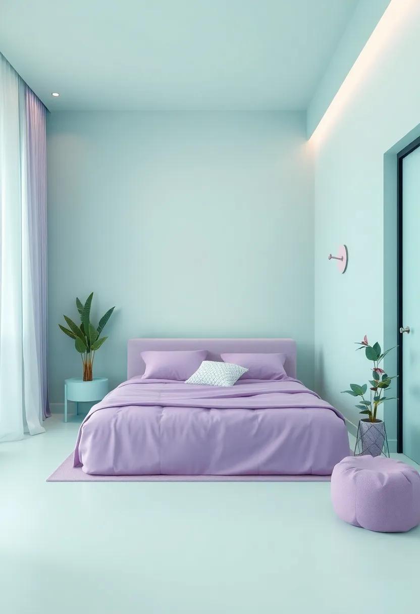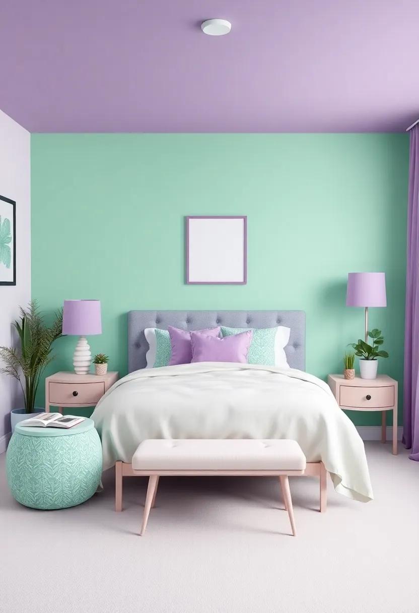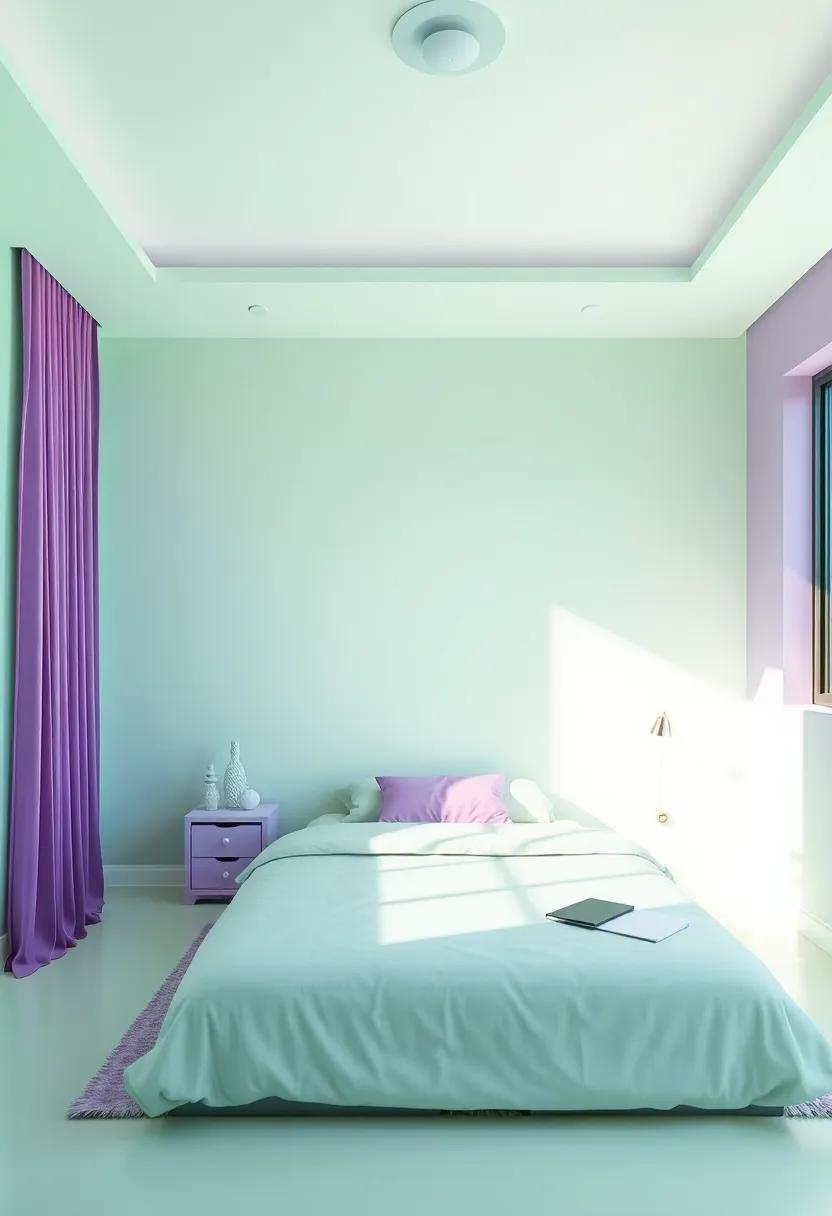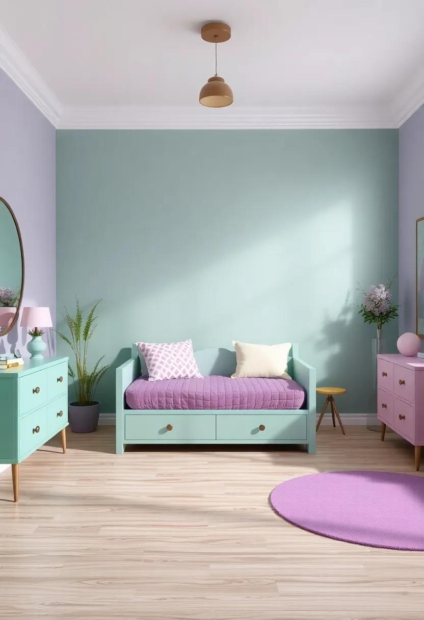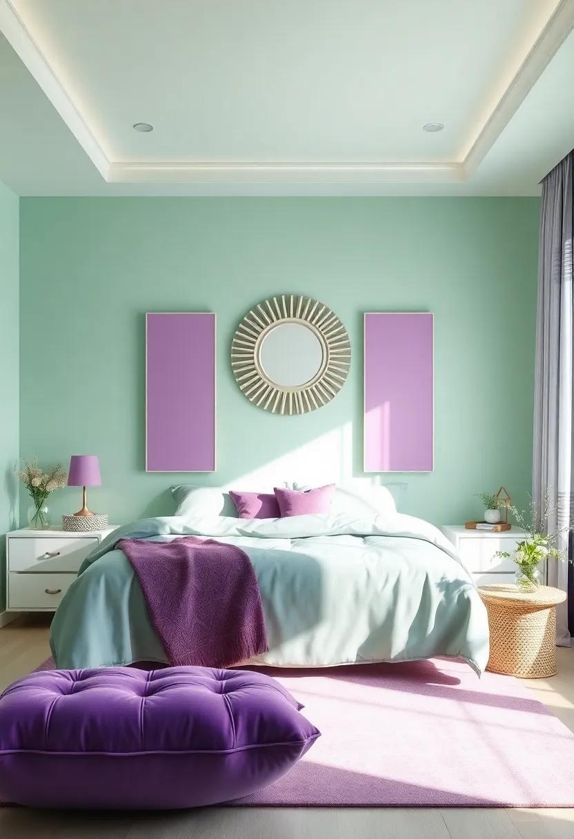 Another fantastic way to enrich the room’s ambiance is through mixed-media pieces that combine elements like fabric, paint, and natural materials. Opt for canvas art with splashes of mint green splattered among soft purples, adding depth and texture to the overall design. Framed photographs with harmonious colors can also elevate the space; think about creating a gallery wall that showcases personal moments or inspirational quotes. Here, each piece acts as a conversation starter, reflecting the personality and passions of the occupant. for more artistic inspiration, explore Artsy to discover diverse styles and ideas that resonate with your theme.