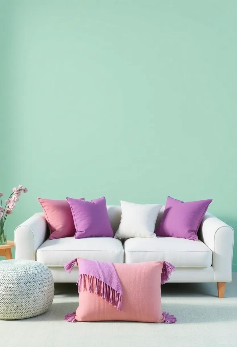 - Textured Throw Pillows: Mix shades of mint green and deep purple with various patterns, like geometric or floral prints.