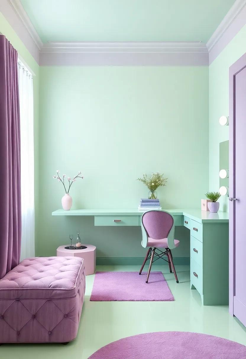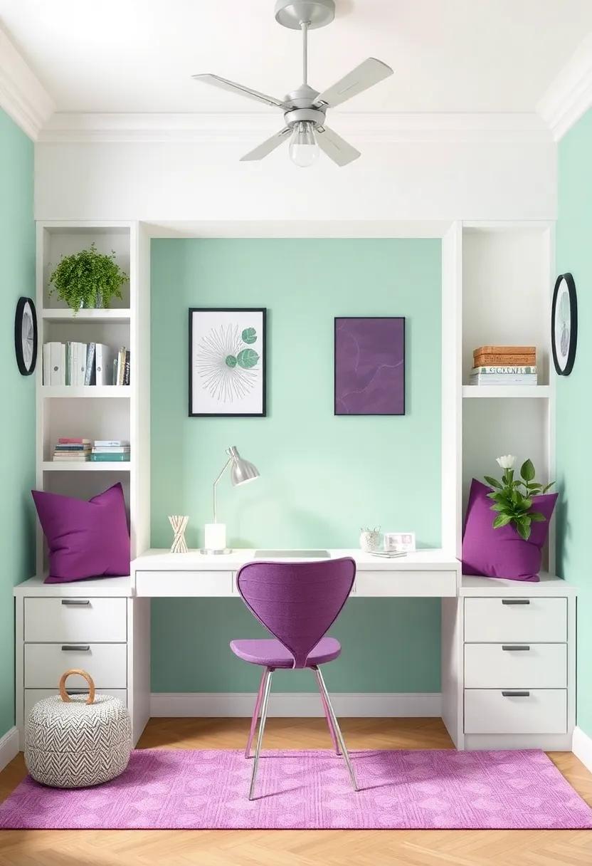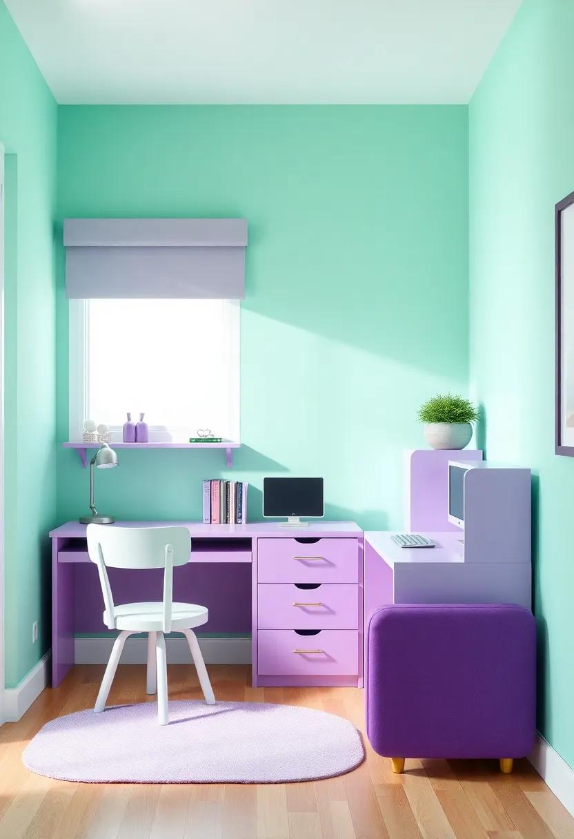 Create a vibrant study nook that harmonizes functionality with style by incorporating mint green and purple accents throughout the space. Start with a compact desk that complements the wall color, ensuring adequate surface area for books and a laptop. Adorn the desk with organizers in matching shades to maintain a cohesive look and keep supplies readily accessible. Choose a comfortable chair that allows for hours of studying, preferably upholstered in a soft fabric that echoes the mint green theme. layer in decorative elements, such as a pinboard or a few framed prints, that inspire creativity and motivate productivity.