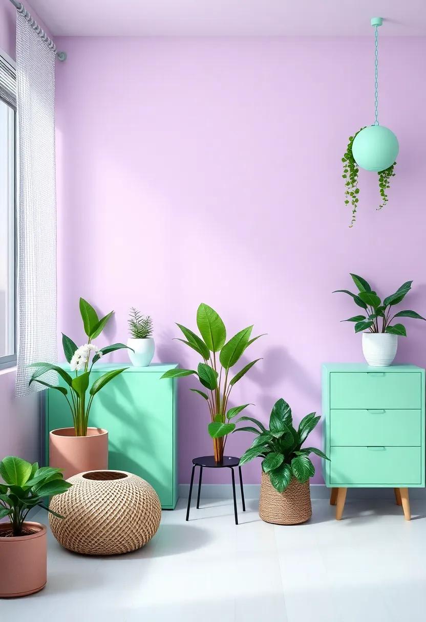 Incorporating plants into a mint green and purple room design instantly enhances the vibrancy and ambiance of the space. The fresh essence of greenery harmonizes beautifully with the cool tones of mint and the warmth of purple, creating a calming yet lively atmosphere. Plants not only serve as decorative elements but also provide numerous benefits that promote well-being and creativity. Consider adding low-maintenance options such as succulents or snake plants that thrive in various light conditions,enabling them to flourish in a teen’s busy lifestyle.
