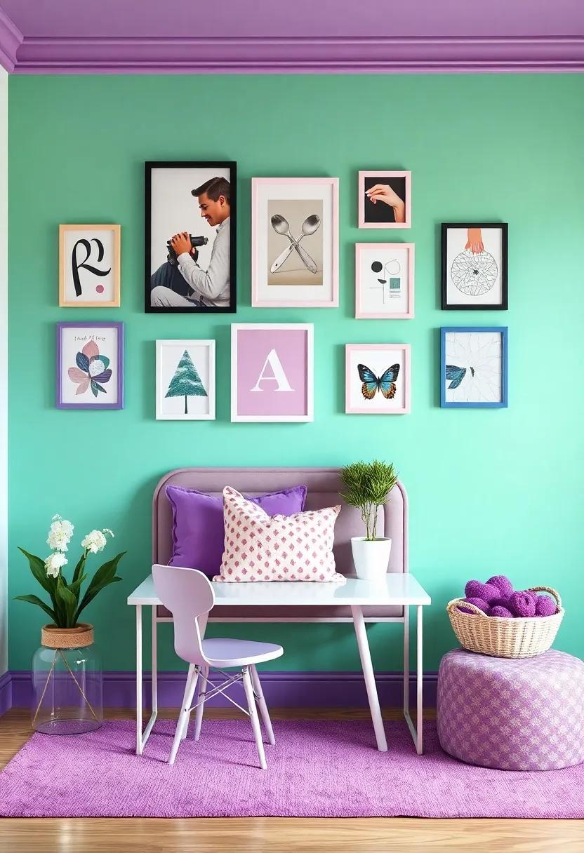 When designing a gallery wall that reflects youthful creativity, it’s essential to curate a collection that resonates with personal interests and allows for a splash of color. Start by selecting a mix of art prints, photographs, and handmade crafts that convey individuality and inspiration. Incorporating elements like framed sketches, motivational quotes, and vibrant abstract art can elevate the design. Utilize a color scheme that harmonizes with your mint green and purple theme, such as pops of gold or coral to create balance and energy. Layering different frame styles—think of a mix between modern acrylic and vintage wooden frames—adds depth and character.