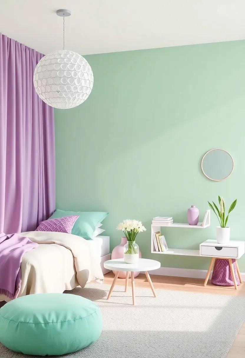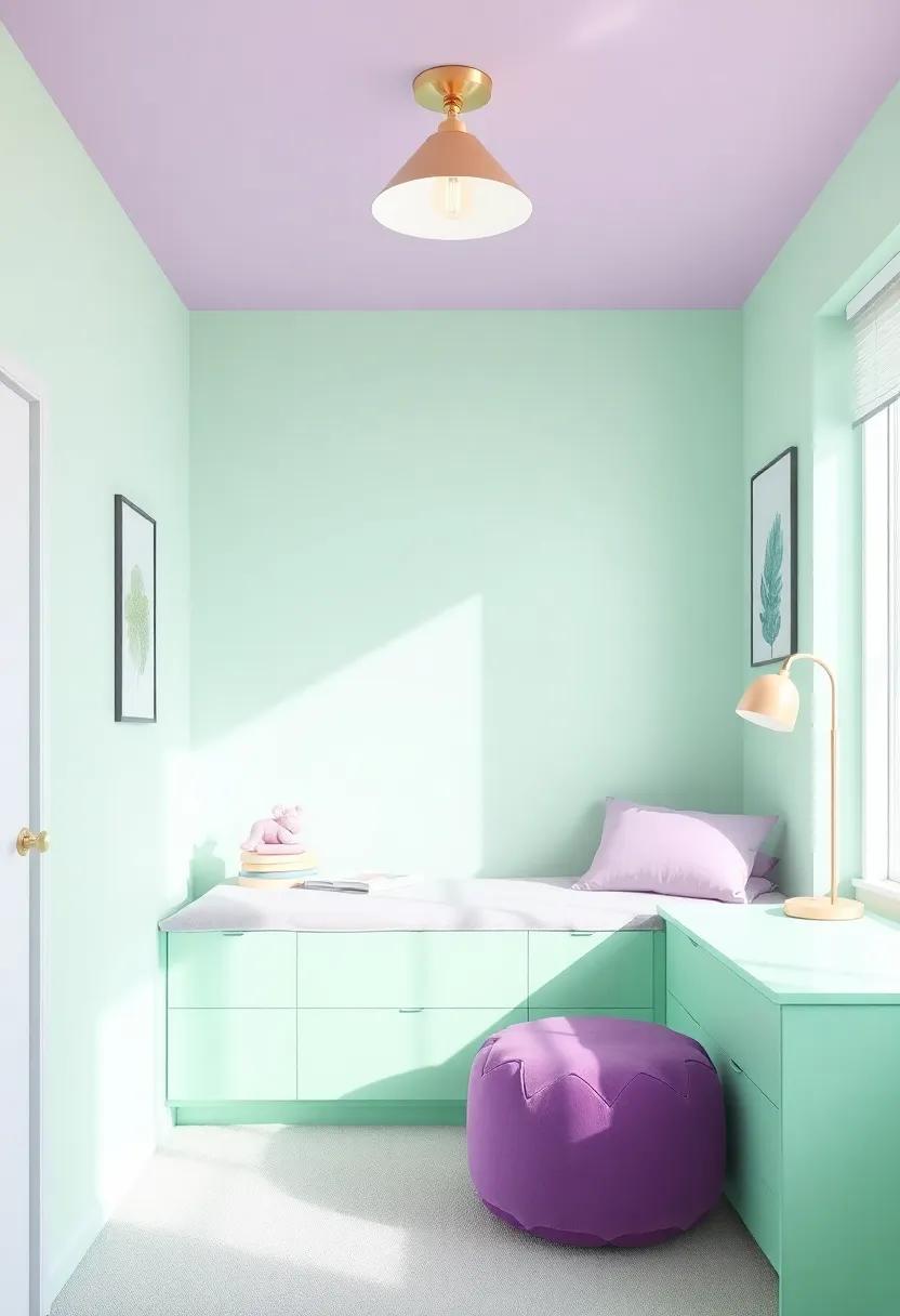 incorporating innovative lighting fixtures can transform a mint green and purple teen space into a luminous paradise. Consider pendant lights with a modern twist — think geometric shapes in brass or matte black that can hang dramatically above study areas or comfy seating corners. Floor lamps with adjustable heights and unique colors can add a playful layer, perfectly complementing the room’s pastel palette while providing functional illumination for late-night reading or crafting sessions.