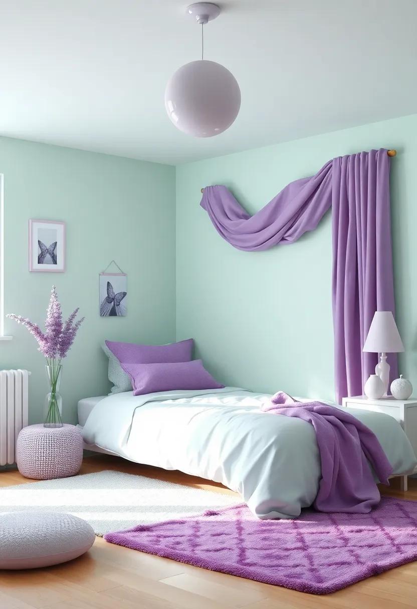 - Textiles: Use a mix of mint green and purple fabrics for curtains and bedding to unify the color scheme.