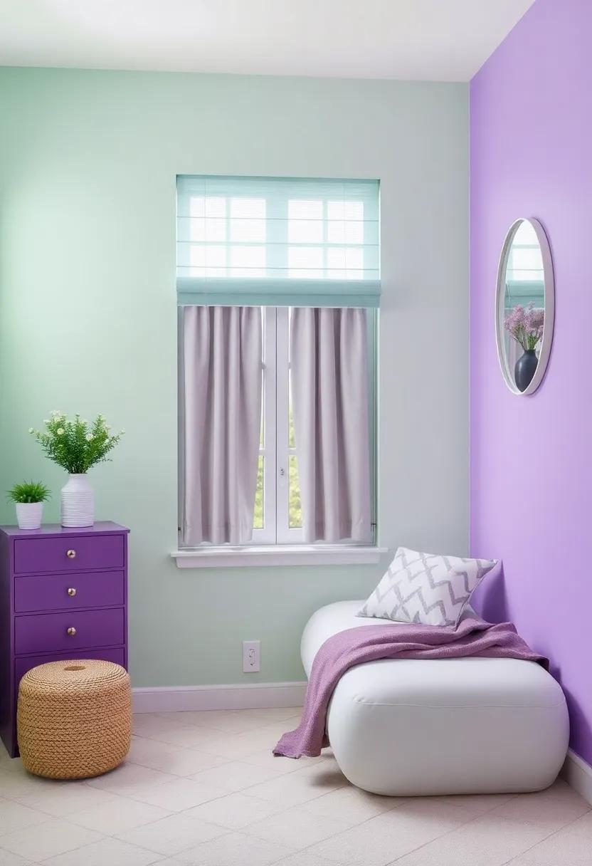 To truly elevate a mint green and purple room, consider window treatments that complement the calming and vibrant tones of the space. Sheer curtains in soft white or pale lavender can create an ethereal effect, allowing natural light to filter through while adding a delicate touch. for those looking for something bolder, opt for roller shades in a darker shade of purple to create contrast and drama. These choices not only enhance the aesthetic but also provide practical benefits, such as light control and privacy.