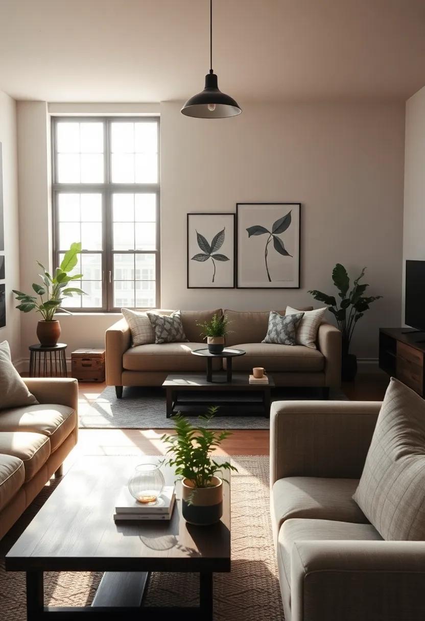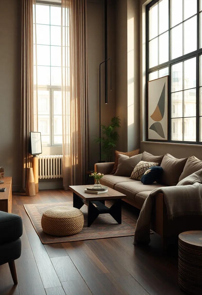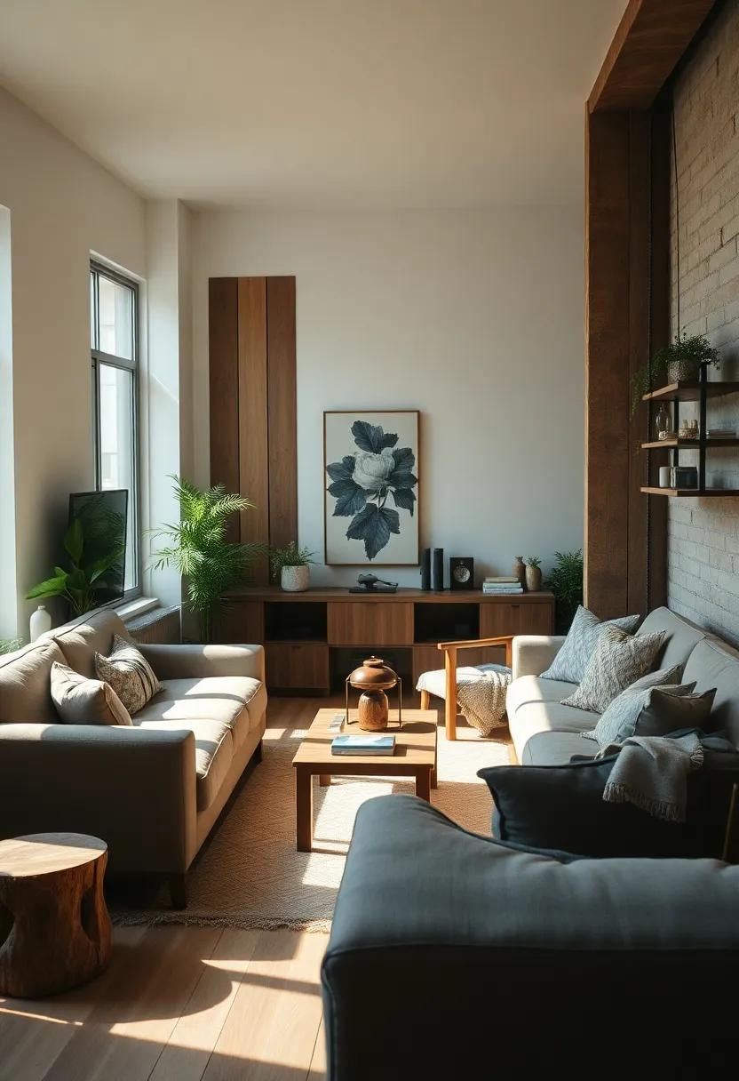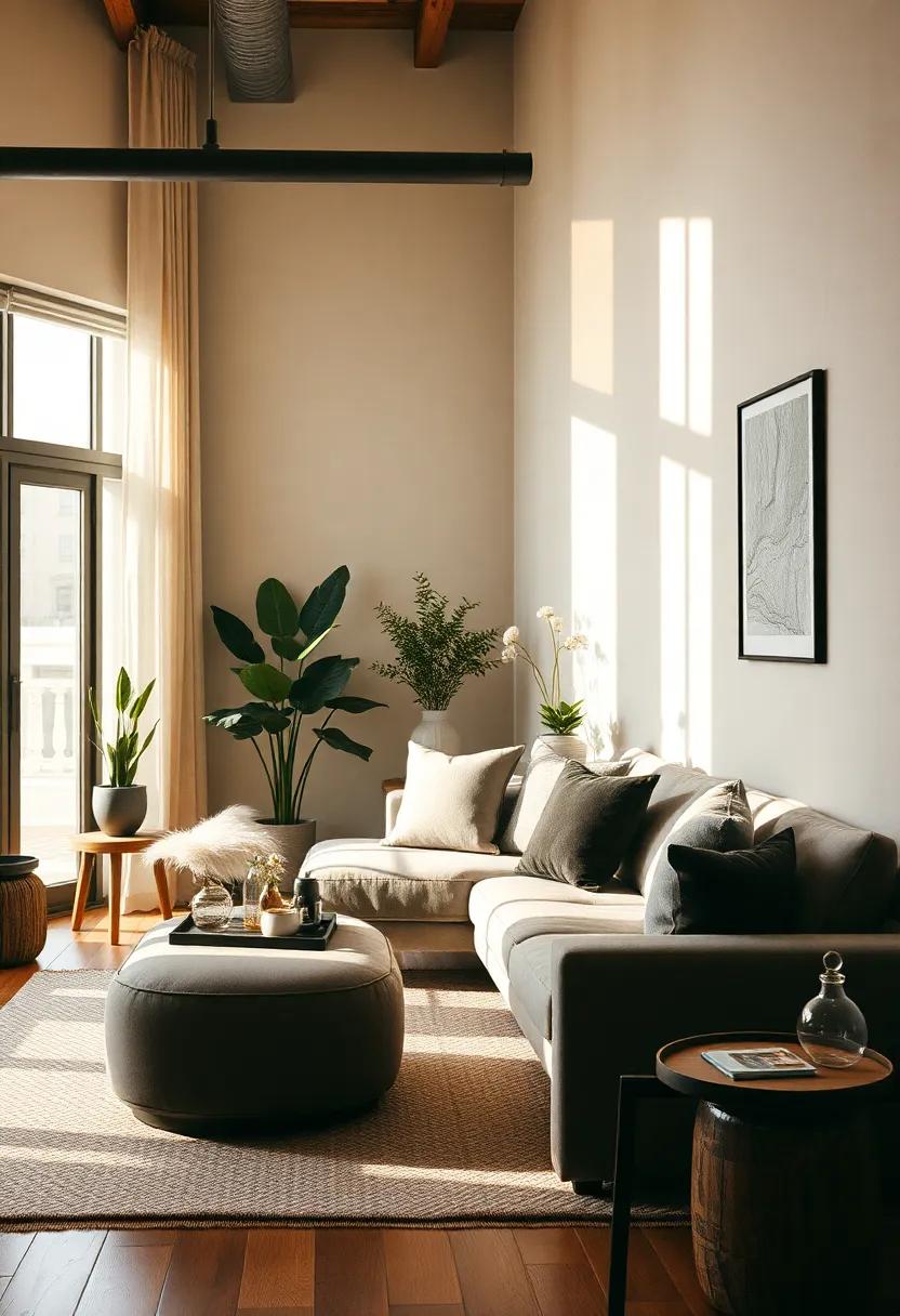 Incorporating elements such as wood furnishings or metal accents can further elevate the overall aesthetic, creating a dynamic interplay between raw materials. The result is a living room that feels both contemporary and timeless, perfectly encapsulating the essence of urban living.