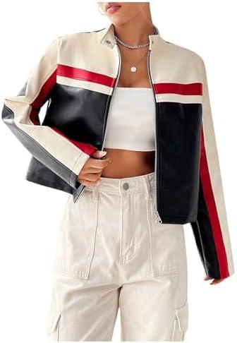 MakeMeChic Women’s Color Block Zip Up Short Jacket Long Sleeve Mock Neck Crop Coat Outwear