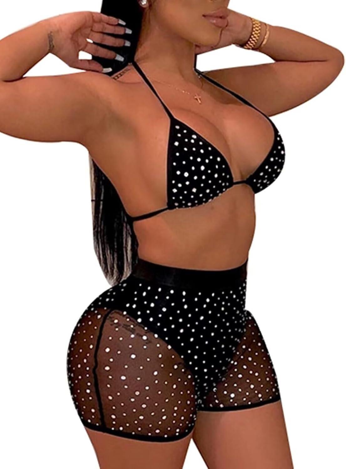This alluring two-piece ensemble features a mesh bikini top and sparkly shorts, making it a perfect choice for beach outings and pool parties. With its chic design and high waist shorts, it flatters a variety of body types and provides a confident look. Made from lightweight materials, it ensures comfort during wear, while the rhinestone embellishments add a touch of glamour.The versatile styling means this outfit can also be worn for festivals or casual summer events, allowing for a seamless transition from sunbathing to socializing.