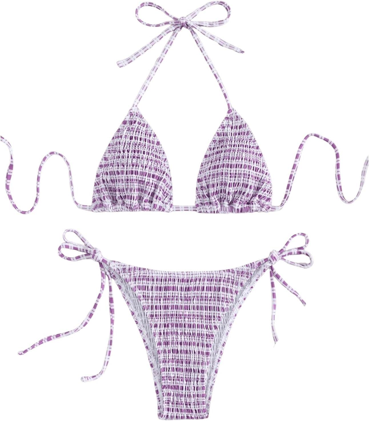 This trendy two-piece swimsuit features a charming plaid design that is perfect for summer getaways. The halter triangle top provides adjustable support, while the tie-side bottoms offer a comfortable and flattering fit. The smocked detailing adds a touch of sophistication, making it suitable for both beach days and poolside lounging. With various size options ranging from XS to L, there’s a fit for most body types. Each size is crafted with precision, ensuring that measurements are close to the specified dimensions: for example, XS features a bust measurement of 33.1 inches and a waist size of 25.2 inches.