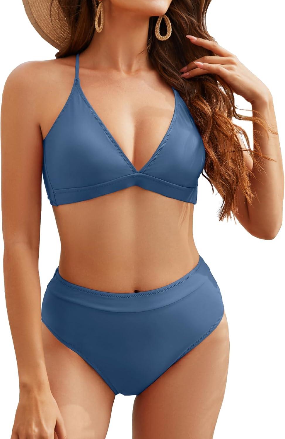 Women High Waisted Bikini Sets Two Piece Criss Cross Back V Neck Bathing Suits High Cut Swimsuits