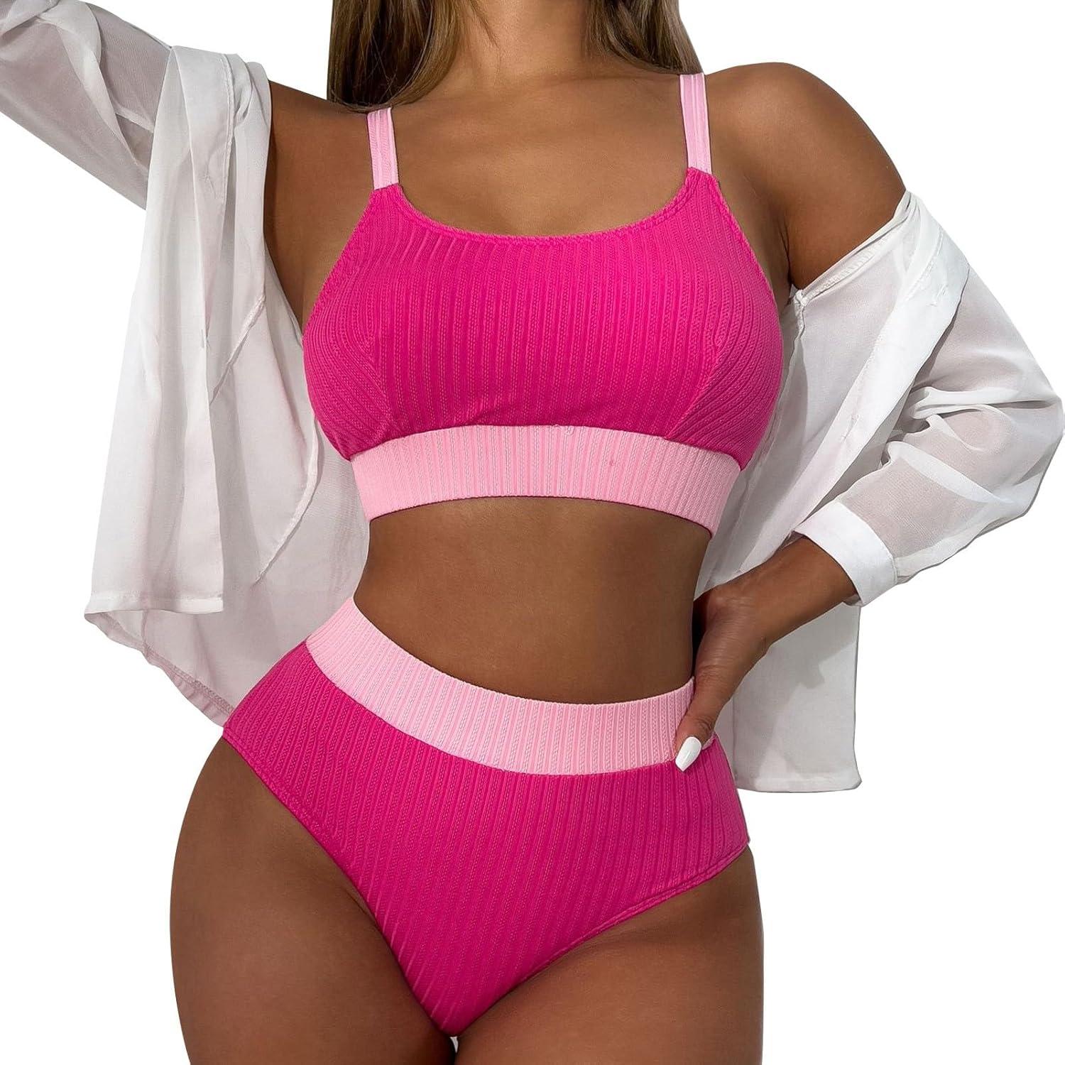 High waisted Bikini sets for Women Tummy control Color block Knitted 2 Piece Bathing suits