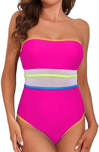 As we dive into the unique design elements of this stunning strapless bathing suit, it’s impossible not to appreciate its color block aesthetic that effortlessly captures attention. The vibrant combination of colors is not only eye-catching but tailored to enhance our natural curves. The mesh waist detail adds a touch of sophistication, creating a flattering silhouette while providing substantial tummy control. The overall structure showcases a remarkable one-piece design that manages to blend style with functionality, ensuring we feel confident during our beach outings or pool party gatherings.