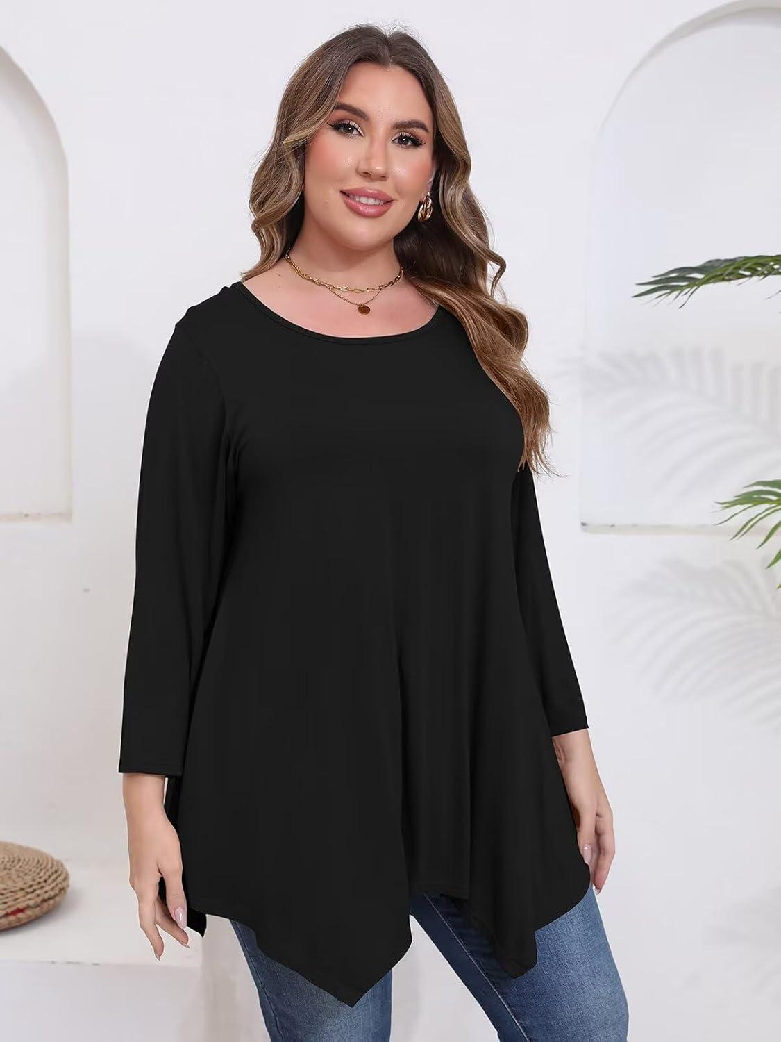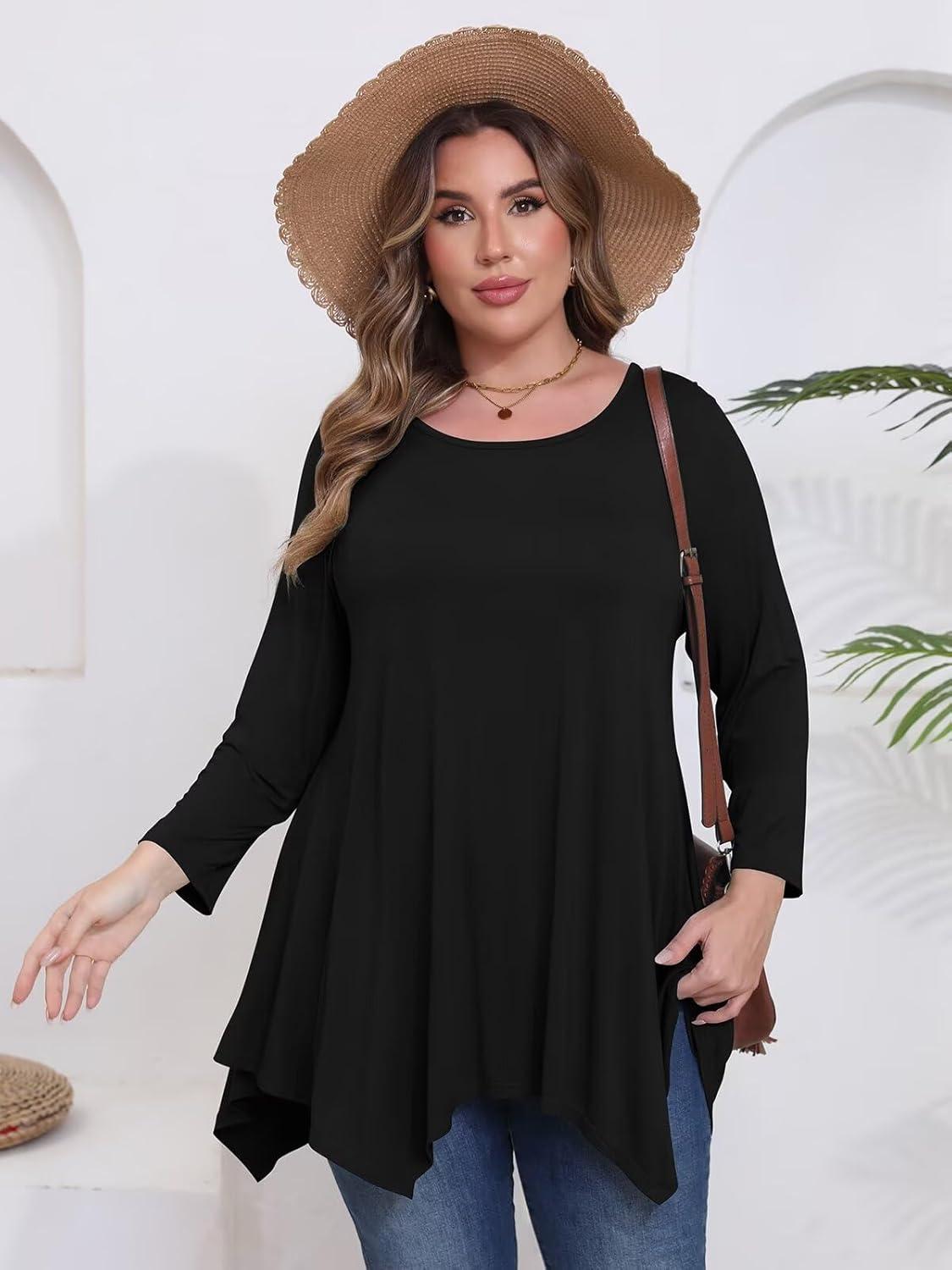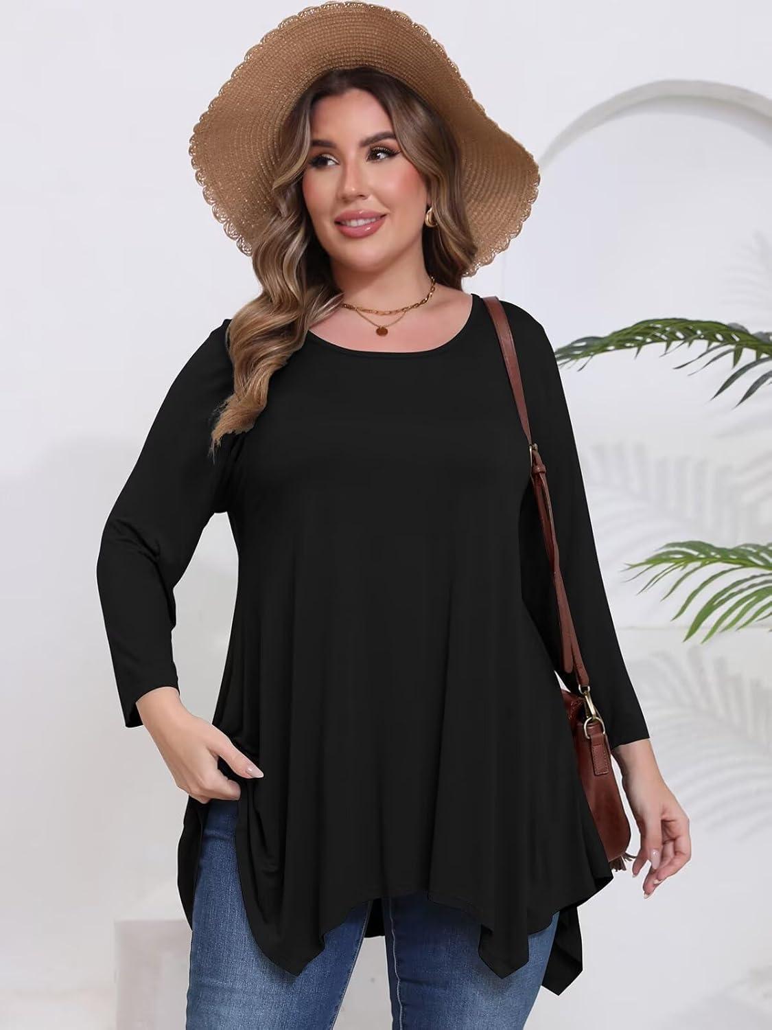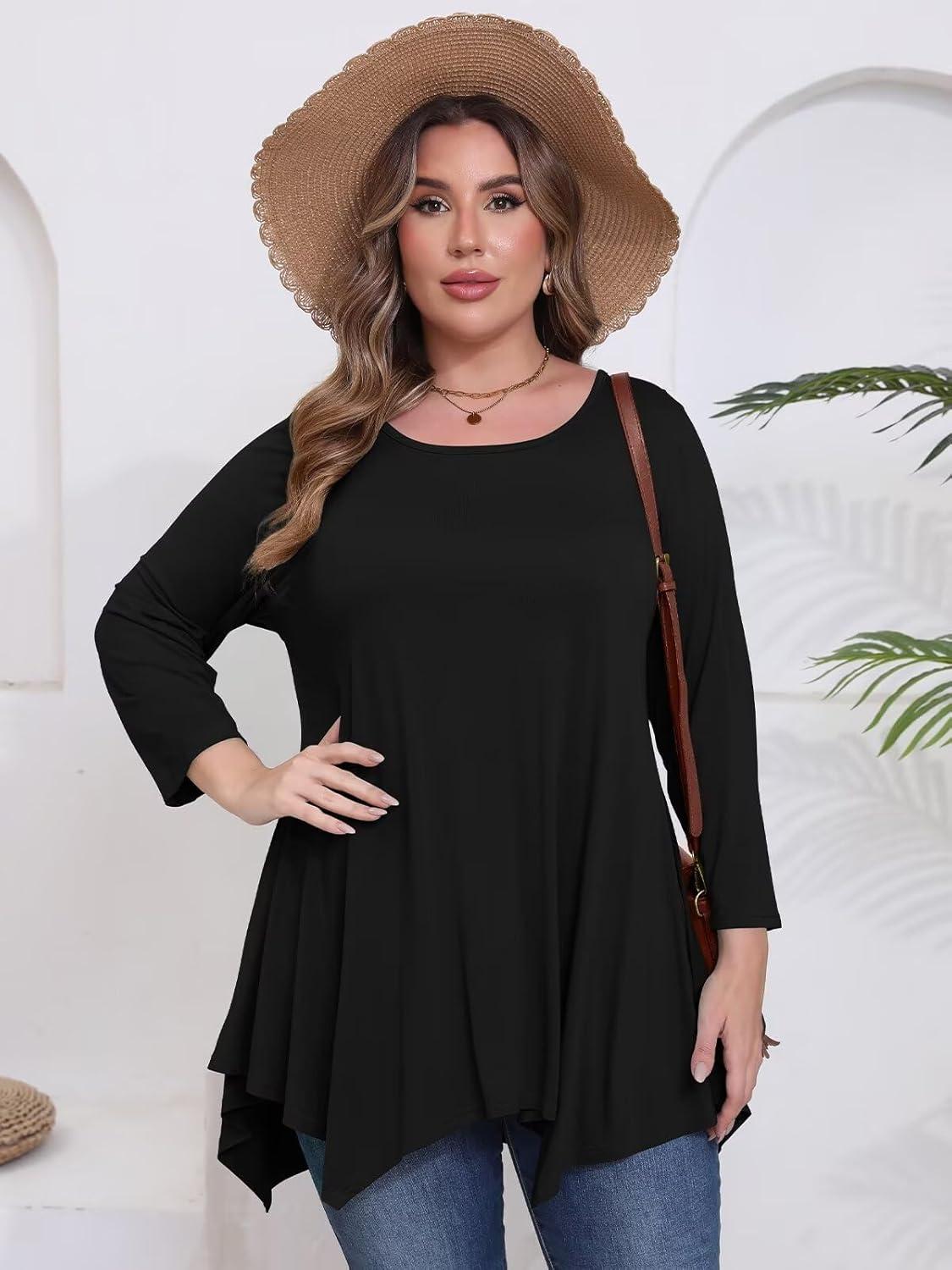 We found these tunic tops to be a versatile addition to any plus size wardrobe, especially for the cooler fall season. The 3/4 sleeves and scoop neck design strike a perfect balance between casual comfort and subtle style. The asymmetrical hem adds a modern twist that complements leggings beautifully,covering hips and tummy with a flattering,loose fit. Made from soft blends including rayon, spandex, and polyester, the fabric feels buttery soft against the skin and offers just enough stretch for all-day wear.Whether for work, casual outings, or weekend get-togethers, these tops hold their shape well and come in a wide range of solid, tie dye, floral, and plaid prints that kept our outfits fresh and captivating.