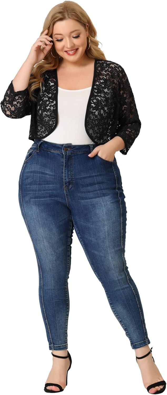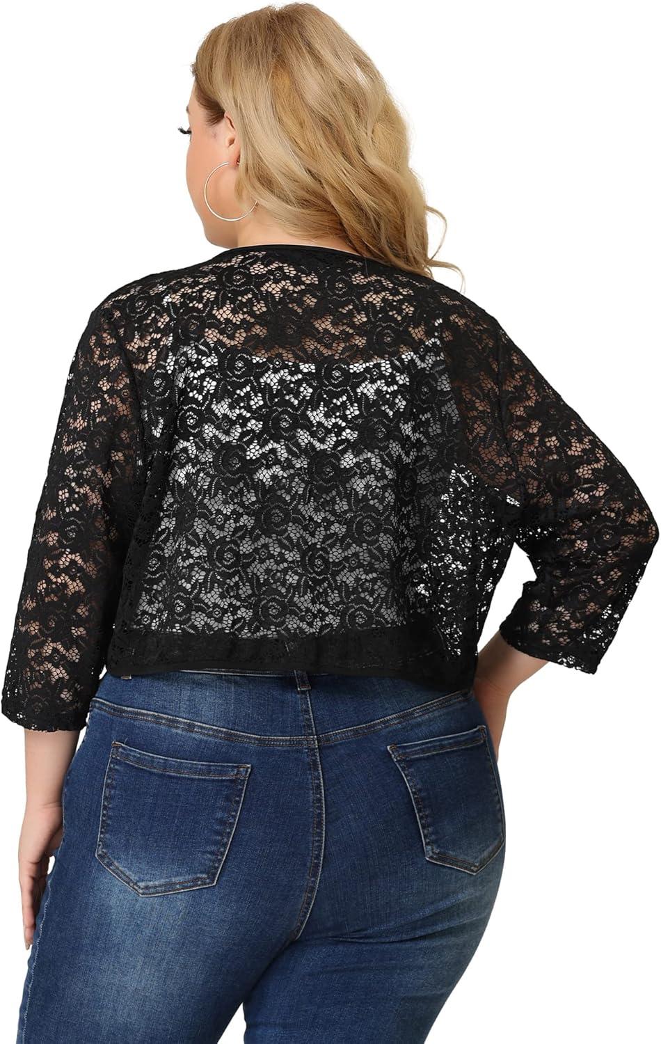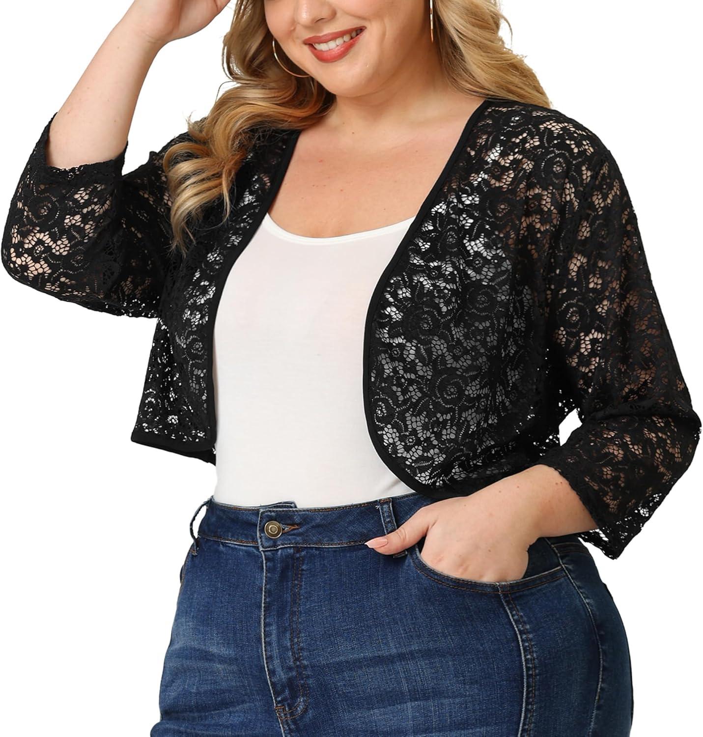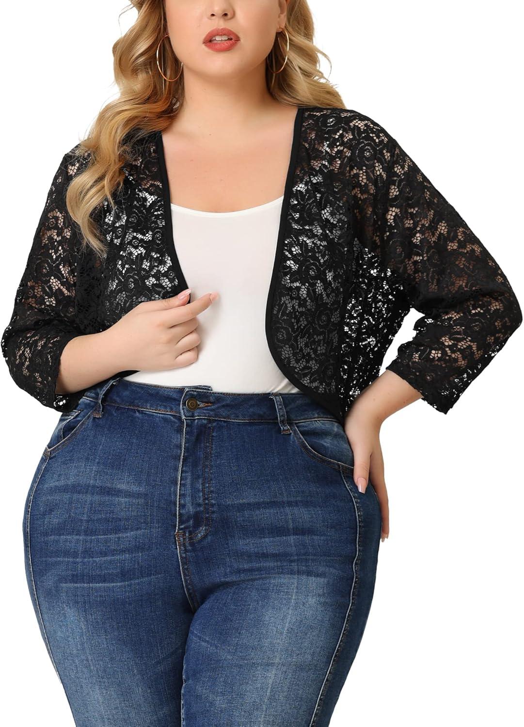 We found this plus size shrug to be a perfect blend of sophistication and comfort, designed with delicate floral lace that adds a feminine touch to any outfit. Its lightweight, sheer fabric offers breathability without sacrificing style, making it an ideal layering piece for both casual and formal occasions.Featuring 3/4 sleeves and an open-front design, it effortlessly enhances your look while providing gentle coverage.