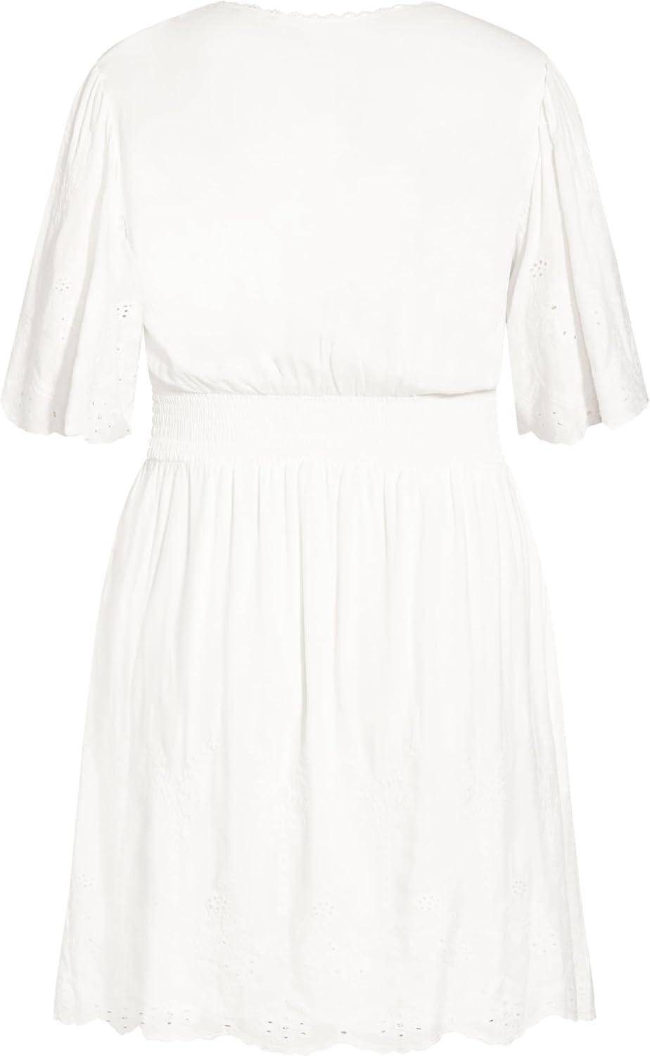 We found this dress to be a graceful blend of style and comfort, embodying the perfect fit for warm summer days. Its ivory tone paired with intricate embroidery lends an air of sophisticated ease, while the V-neckline adds a flattering silhouette. The elasticated, shirred waistband is a smart design choice, ensuring the dress adapts comfortably to various body shapes without losing its tailored charm. Delicate flutter sleeves with scalloped hems contribute a subtle yet elegant feminine touch, making it a versatile option for both casual outings and more polished occasions.