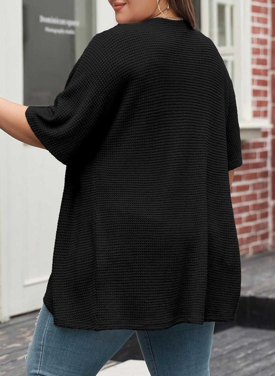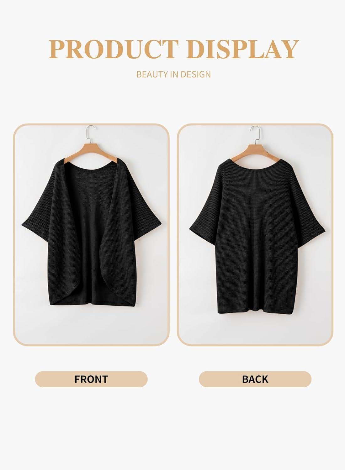 We found this open-front kimono to be a fantastic layering piece that adapts seamlessly to various occasions.The casual short sleeves and waffle knit fabric offer breathability and comfort, making it ideal for all-season wear. Whether paired with jeans for a relaxed weekend look or layered over a dress for a more polished outfit, its lightweight structure keeps us comfortable without feeling bulky. The plus-size range, spanning 1X to 5X, is especially appreciated, as it embraces a wide spectrum of body types while maintaining a flattering silhouette.