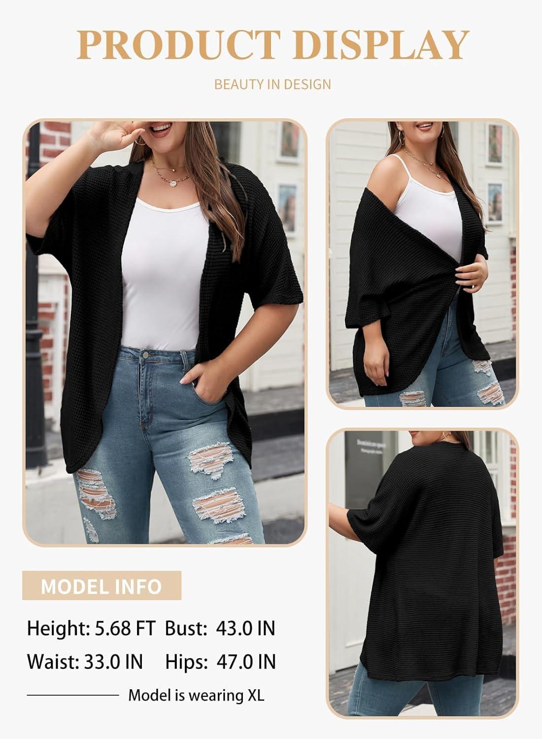 Right from the unpacking moment, this cardigan stands out with its casual, effortless style and comfortable design.Crafted from a soft blend that includes polyester and viscose, the fabric offers a lightweight yet breathable feel-perfect for all-season wear. The short sleeves and open front kimono style create a relaxed silhouette that drapes elegantly, making it an excellent layering piece for both warm and slightly cooler days. Available in sizes from 1X to 5X,it embraces inclusivity,ensuring a flattering fit across a range of plus-size figures without sacrificing comfort.