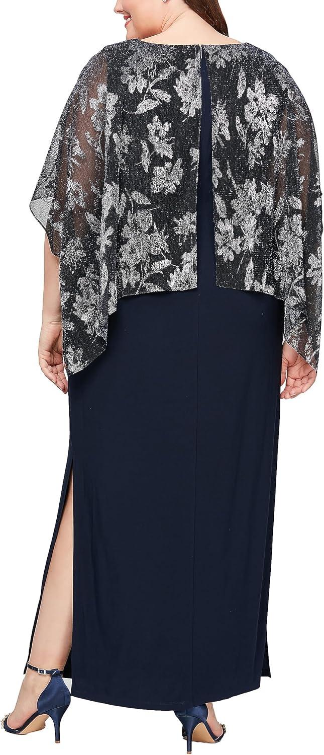 We find this gown to be a remarkable blend of elegance and comfort, perfectly tailored for plus size women seeking a glamorous look without sacrificing ease of movement. The shimmering foil printed chiffon overlay paired with the attached capelet creates a stunning visual impact that flows beautifully with every step. The knit bodice’s subtle stretch ensures a flattering silhouette, making it easy to wear throughout an entire event. Whether you’re attending a formal wedding, gala, or upscale evening affair, this dress balances sophistication and comfort flawlessly.